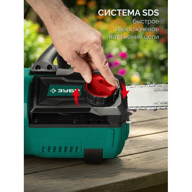 Аккумуляторная цепная пила ЗУБР ПЦБ-4040-42, предназначена для пиления досок, бруса, стволов различных пород дерева, обрезки сучьев и ухода за садовыми деревьями (с приводом режущего инструмента от электрического двигателя).Характеристики ЗУБР ПЦБ-4040-42: