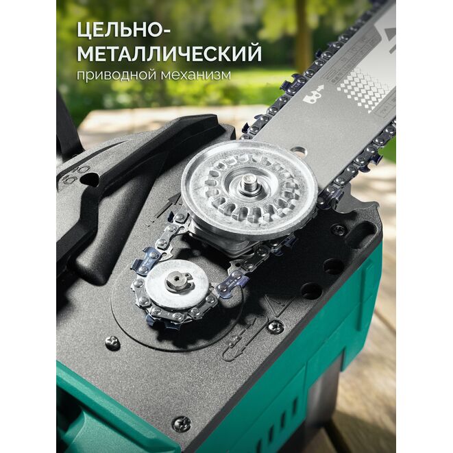 - Высокопроизводительная цепь с шагом 3/8 дюйма позволяет уверенно прорезать толстые ветки