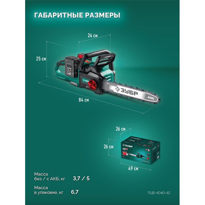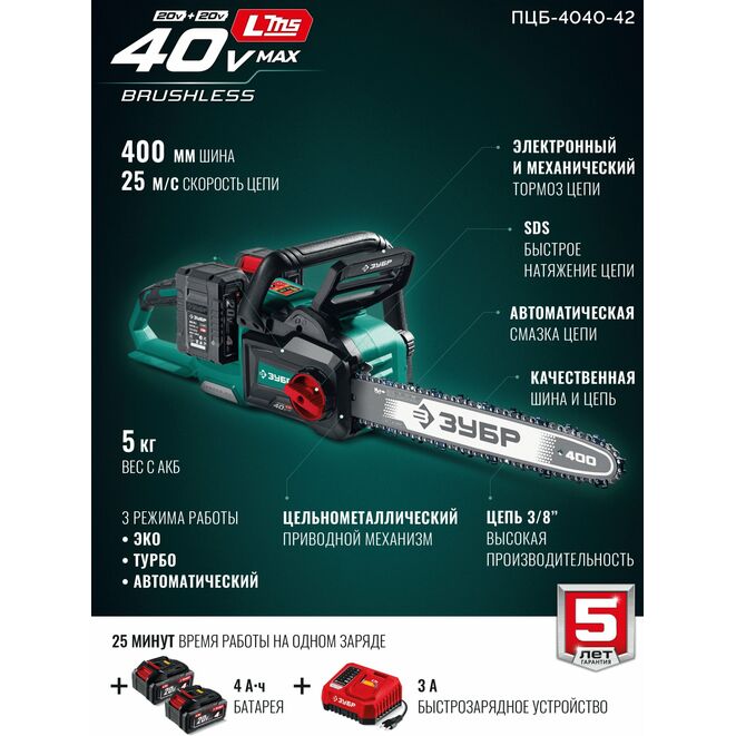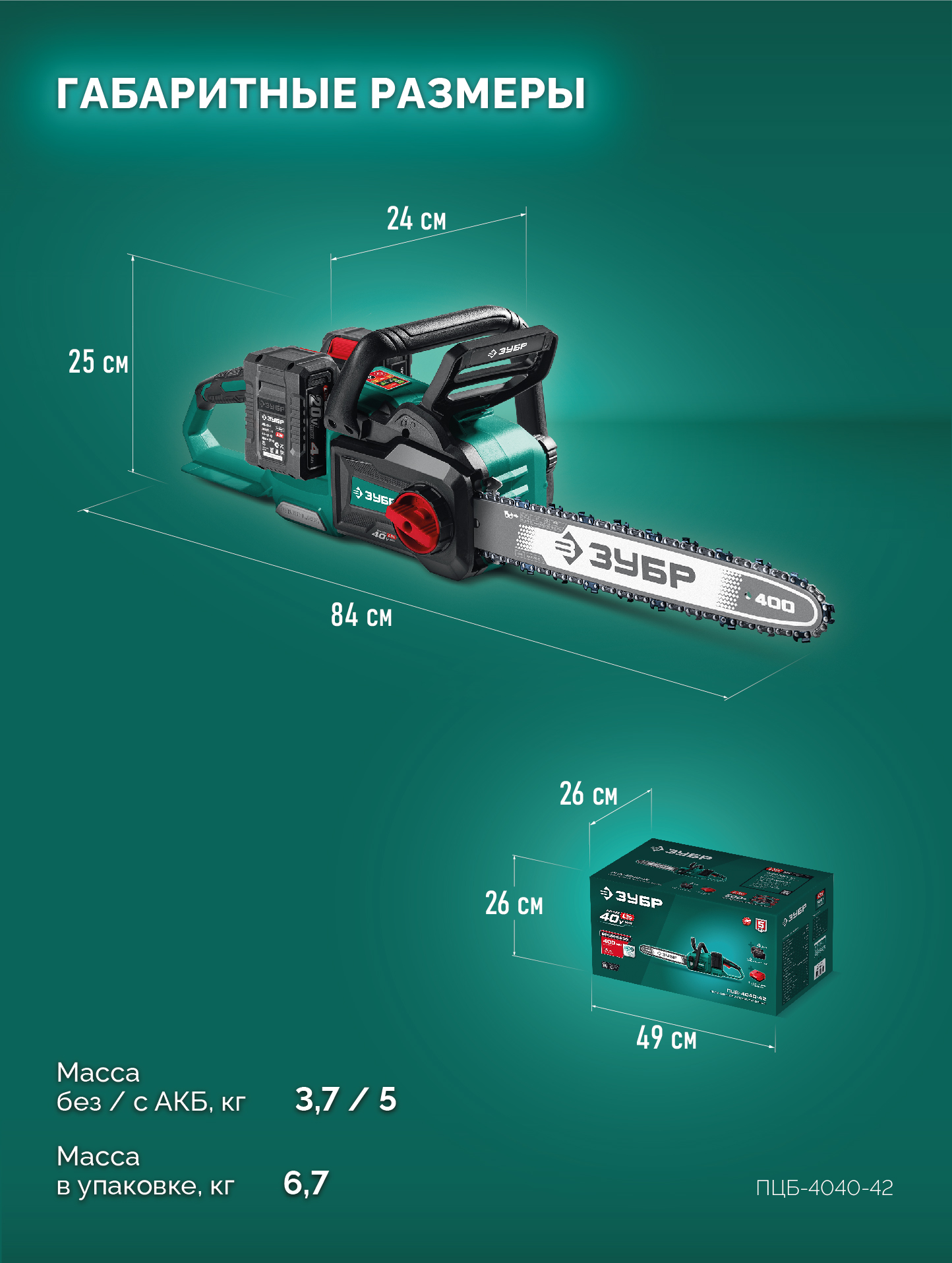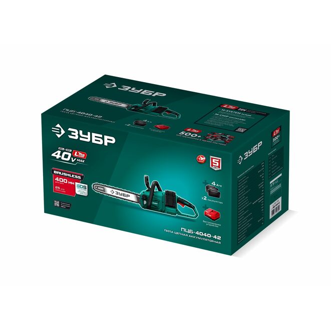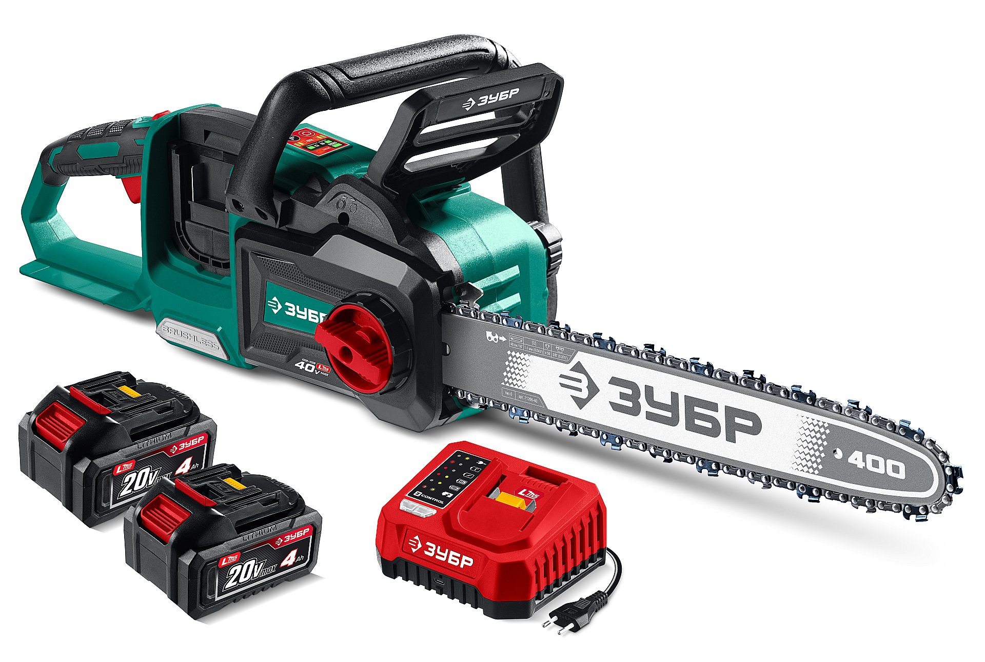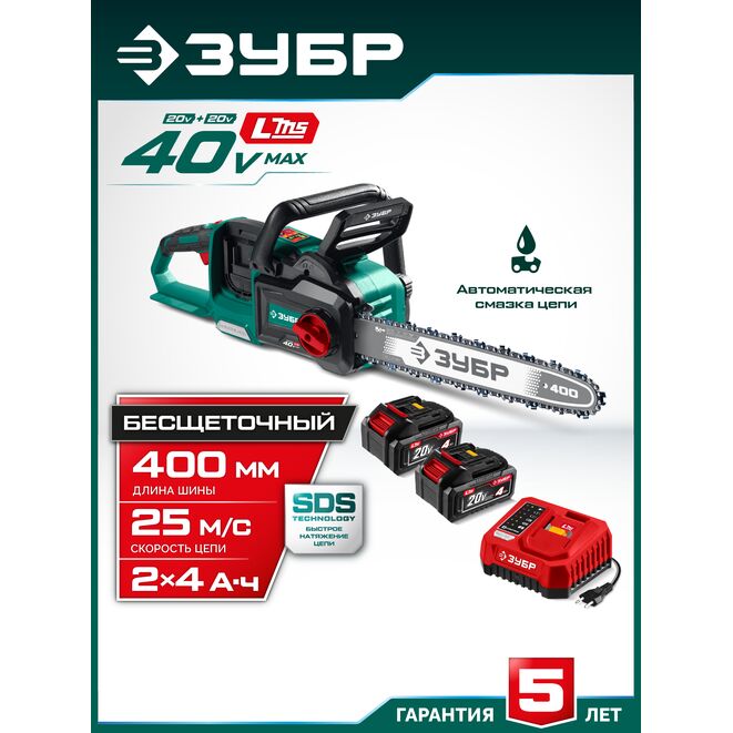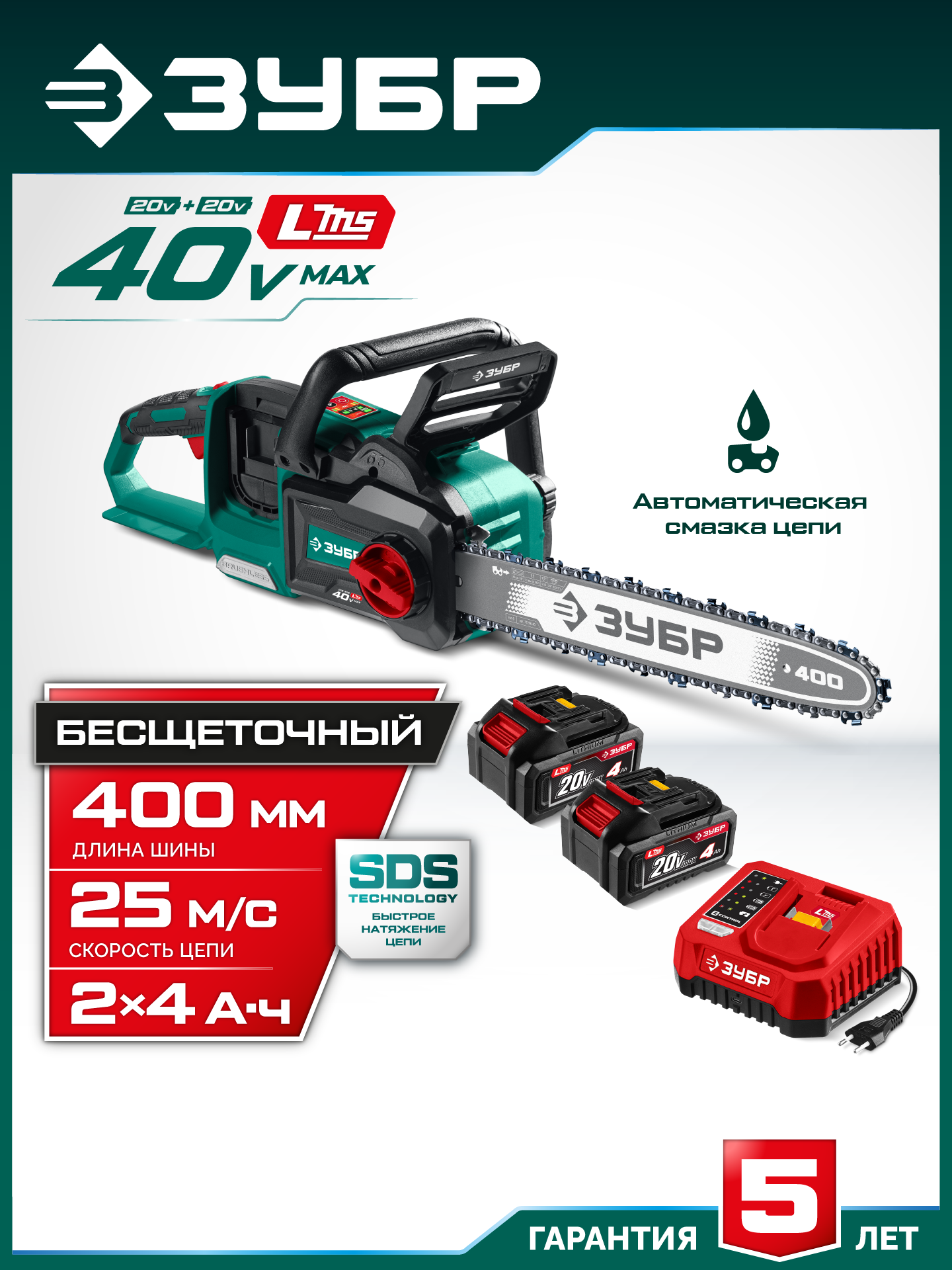 Принадлежности для ЗУБР 40 В, (2x20В), 400 мм шина, 2 АКБ LMS (4 Ач), пила цепная аккумуляторная (ПЦБ-4040-42):