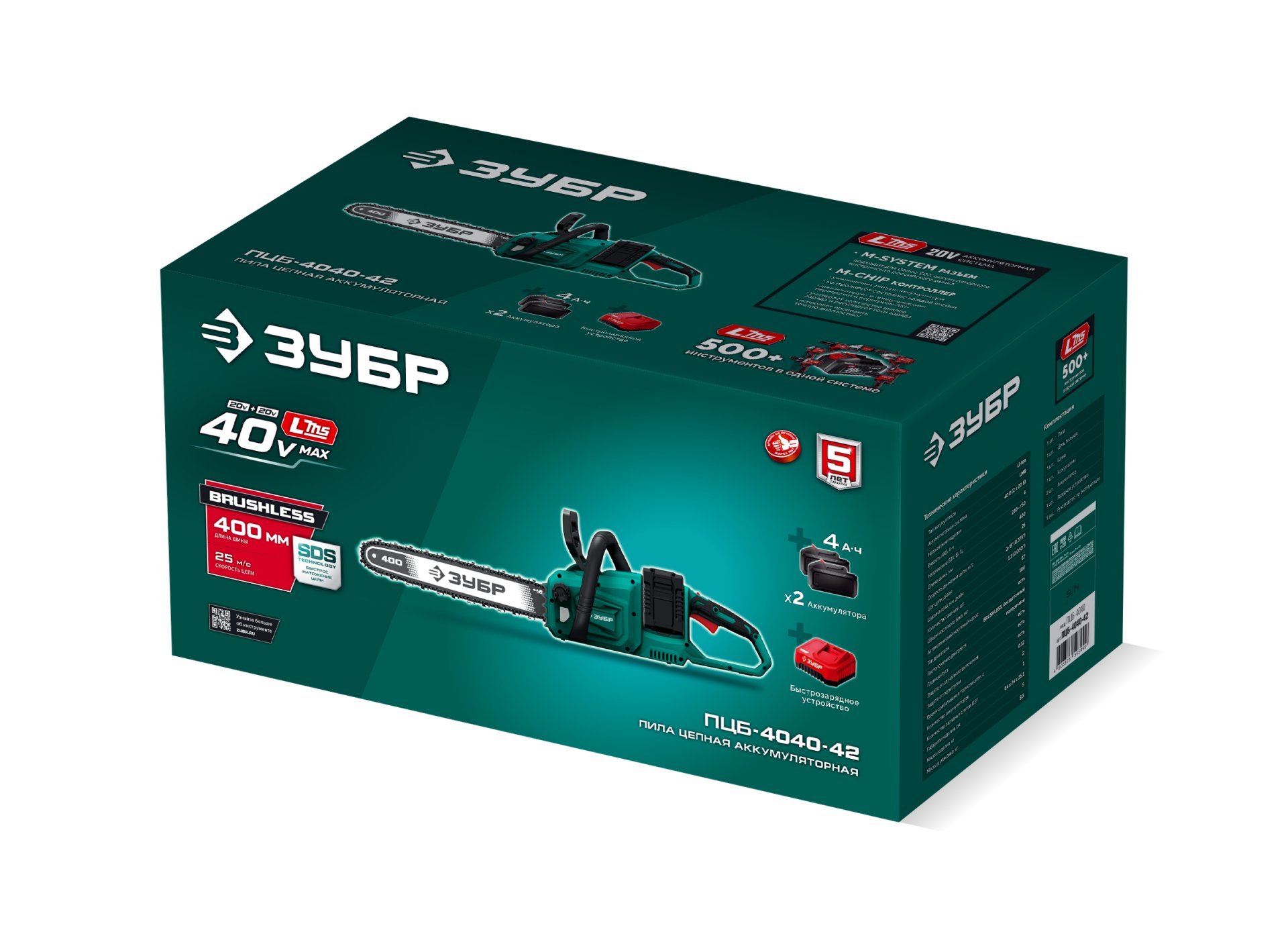 ЗУБР 40 В, (2x20В), 400 мм шина, 2 АКБ LMS (4 Ач), пила цепная аккумуляторная (ПЦБ-4040-42)