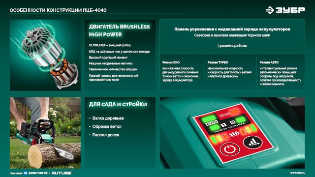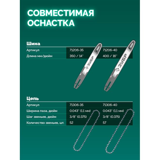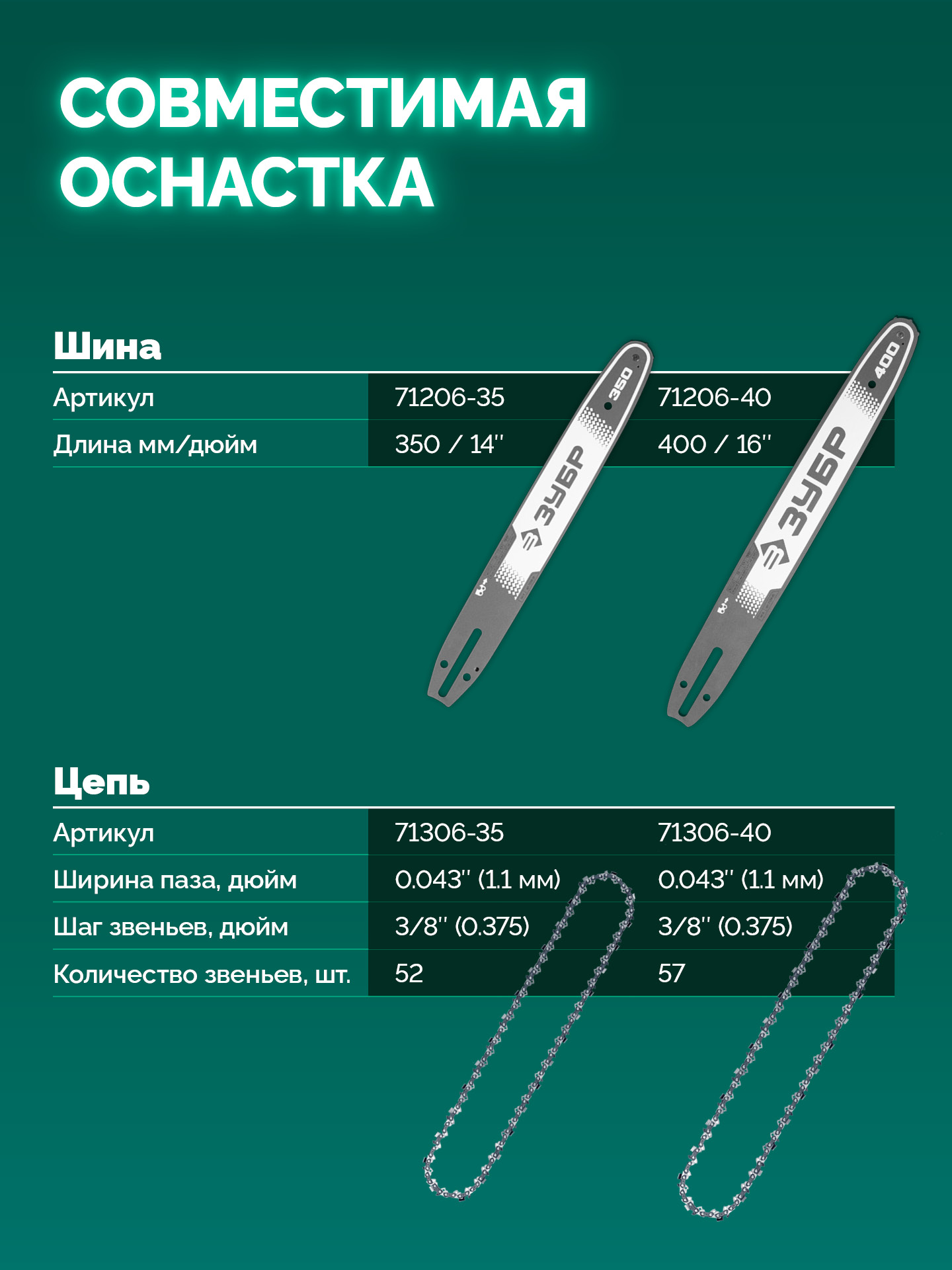 - Качественные шины и цепи ЗУБР обеспечивают отличную производительность