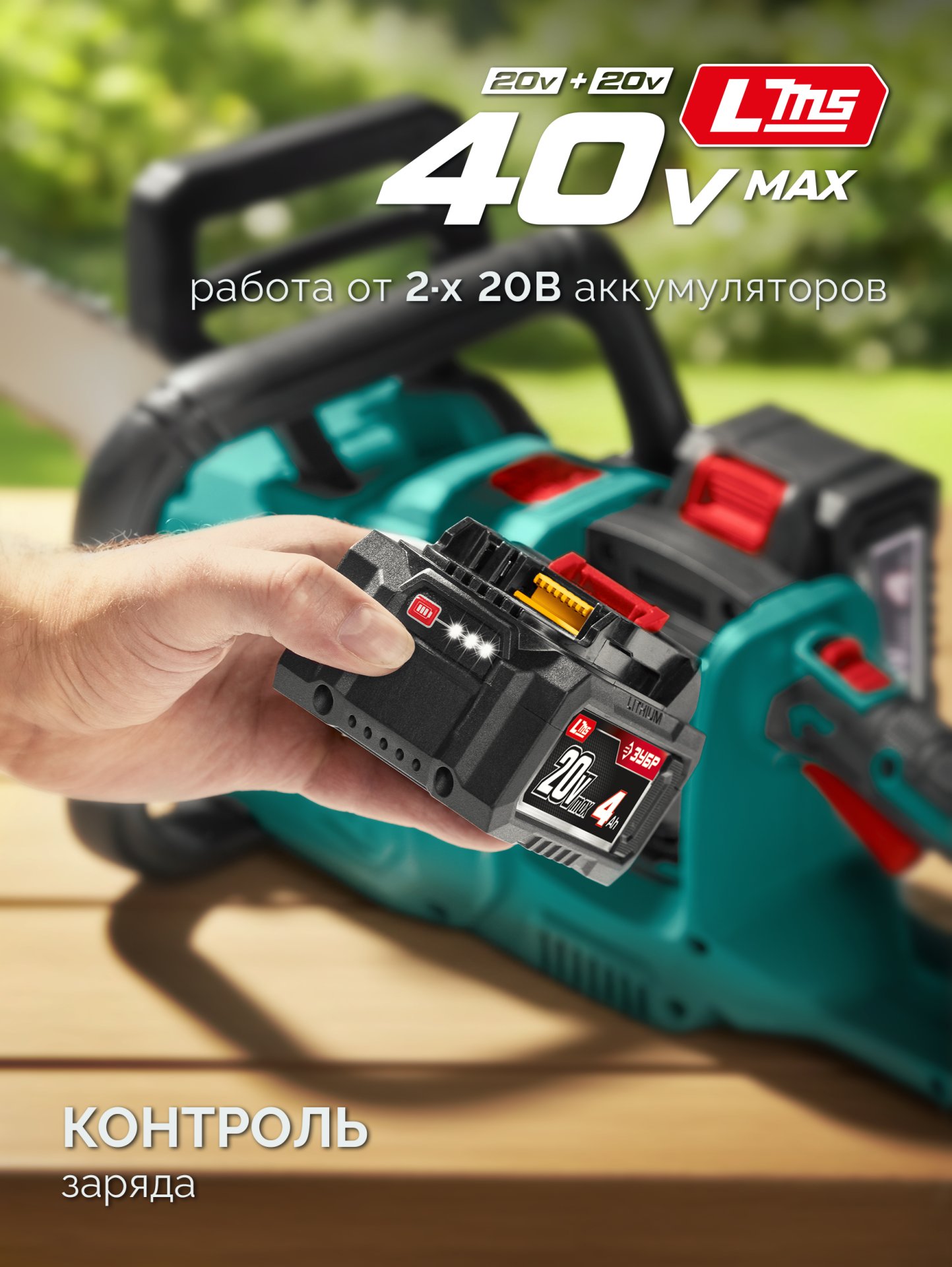 ЗУБР 40 В, (2x20В), 400 мм шина, без АКБ (LMS), пила цепная аккумуляторная (ПЦБ-4040)