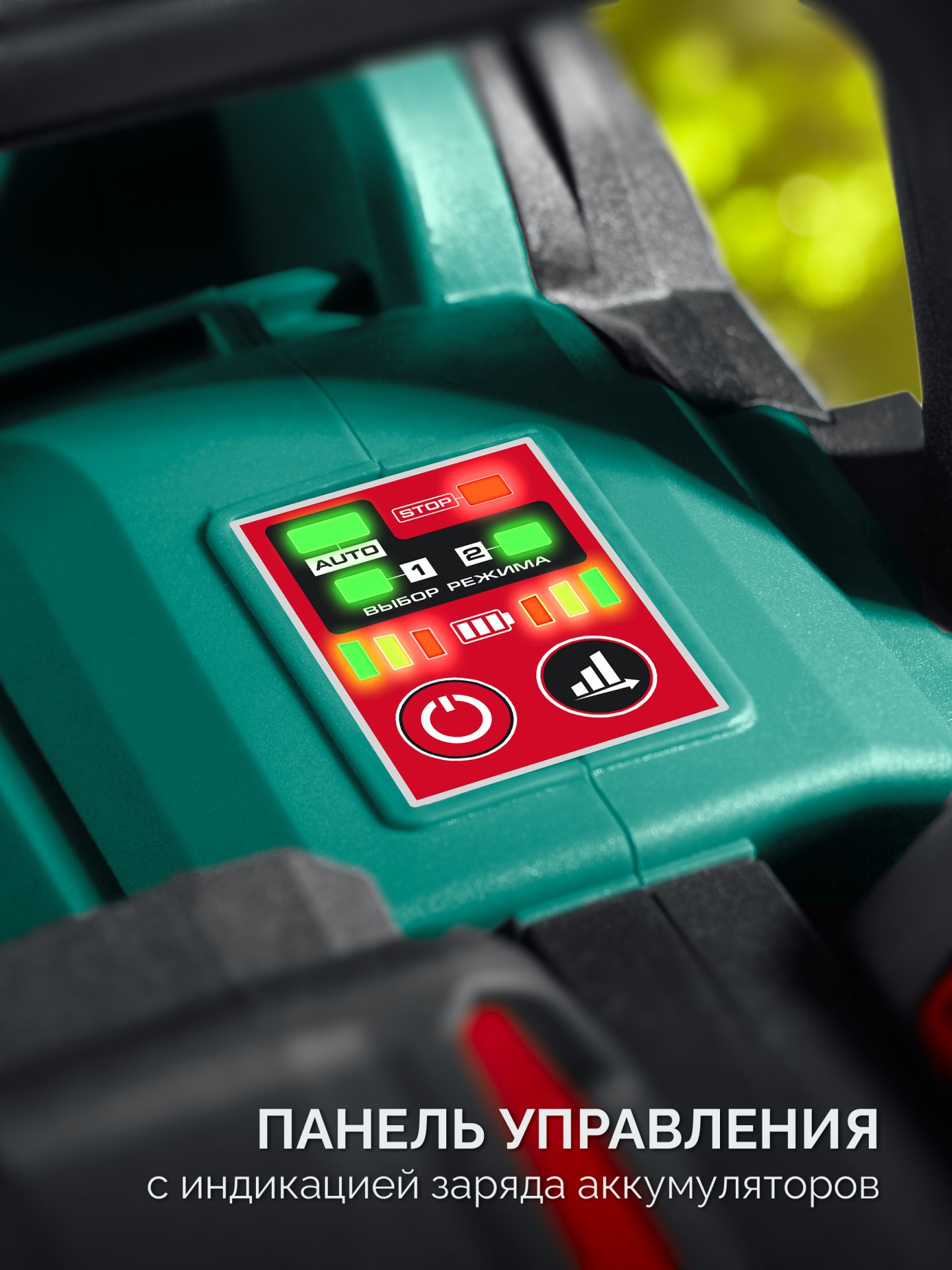 - Панель управления с индикацией заряда аккумуляторов и настройкой режимов работы
