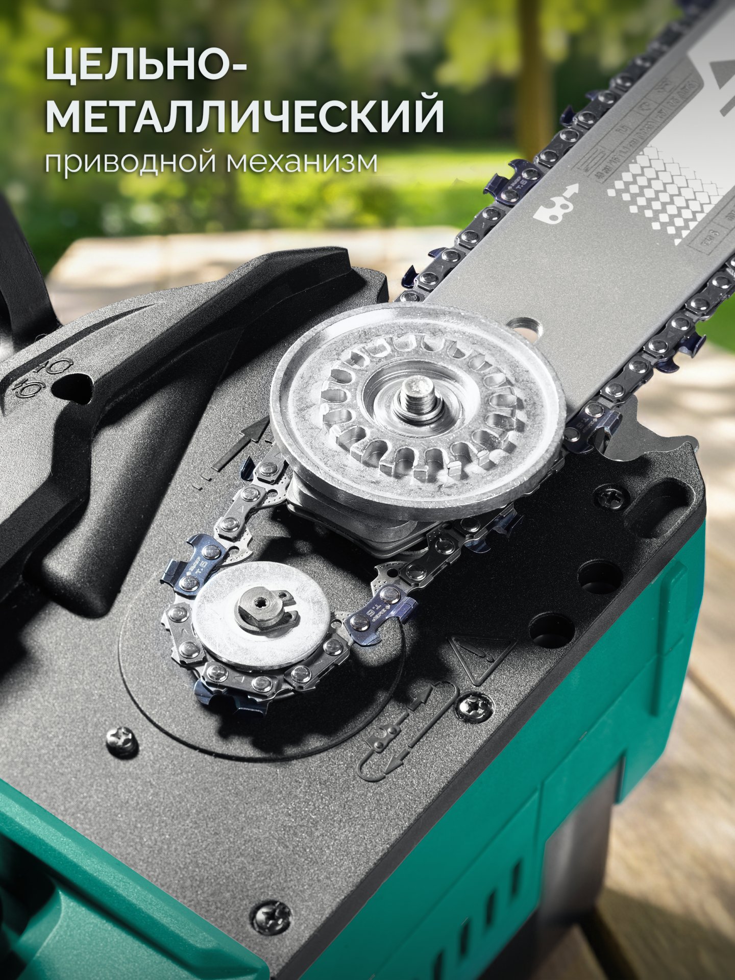 - Высокопроизводительная цепь с шагом 3/8 дюйма позволяет уверенно прорезать толстые ветки
