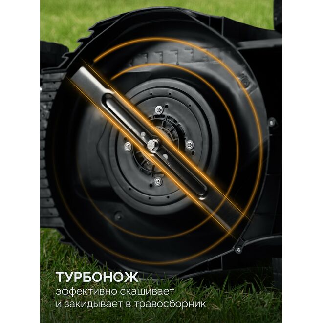 - ТурбоНож создаёт мощный поток воздуха, который поднимает полегшую траву для ровного скашивания и полностью собирает всю скошенную массу и листву