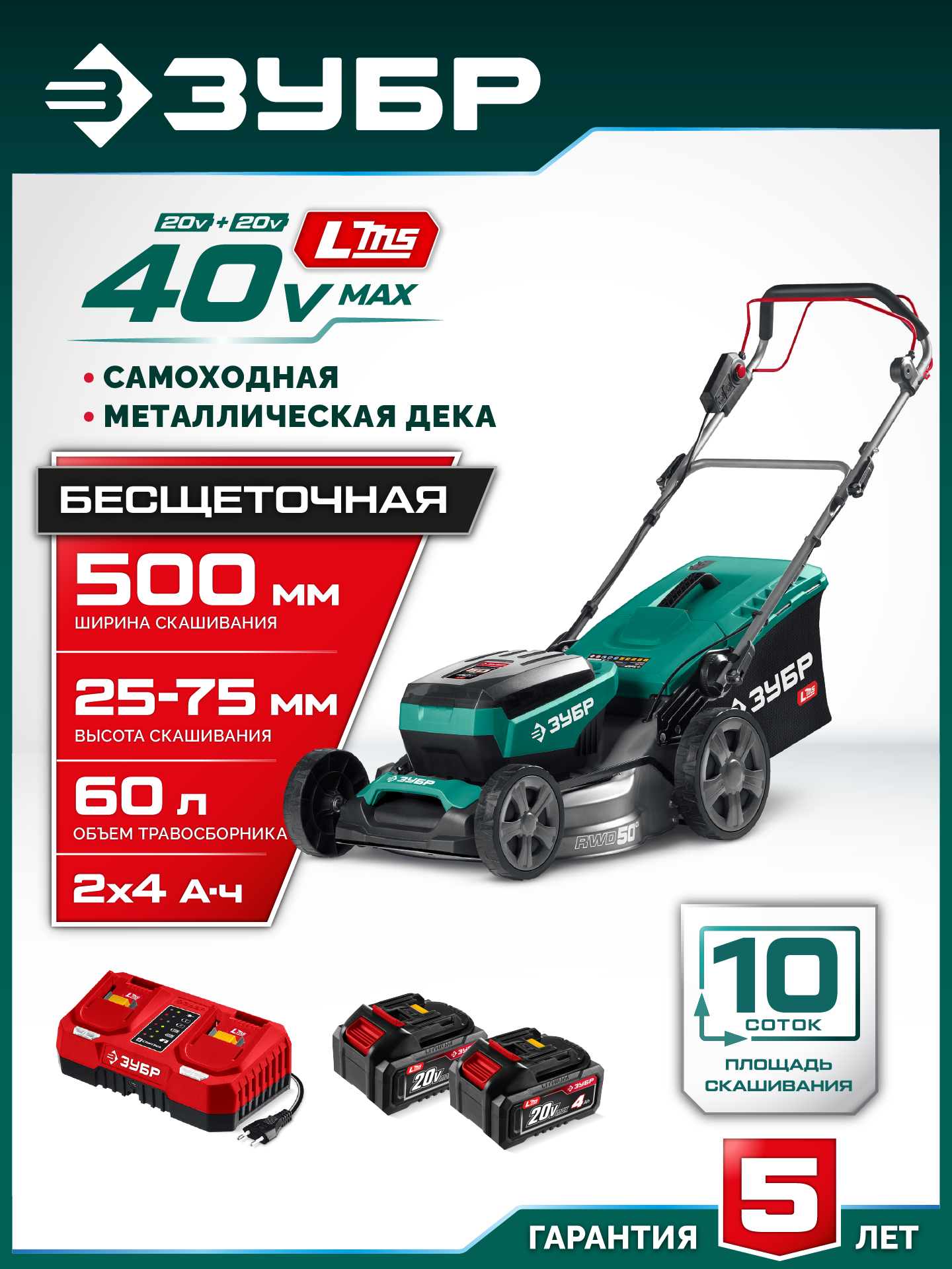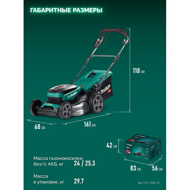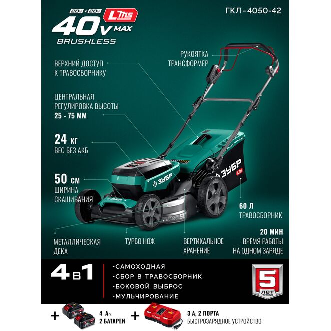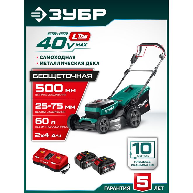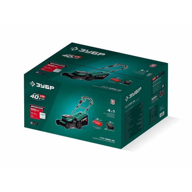 Принадлежности для ЗУБР 40 В (2x20В), 500 мм, 2 АКБ LMS (4 Ач), самоходная газонокосилка аккумуляторная бесщеточная (ГКЛ-4050-42):
