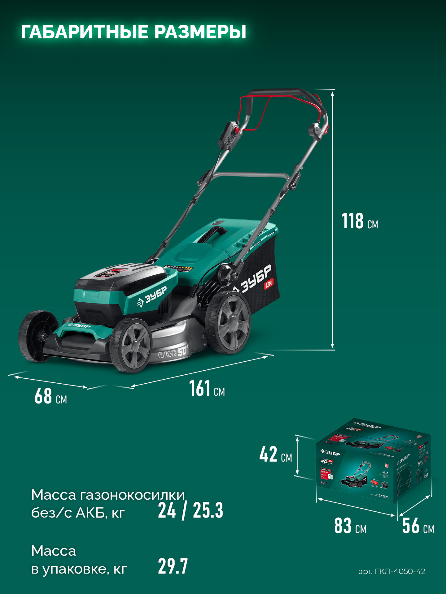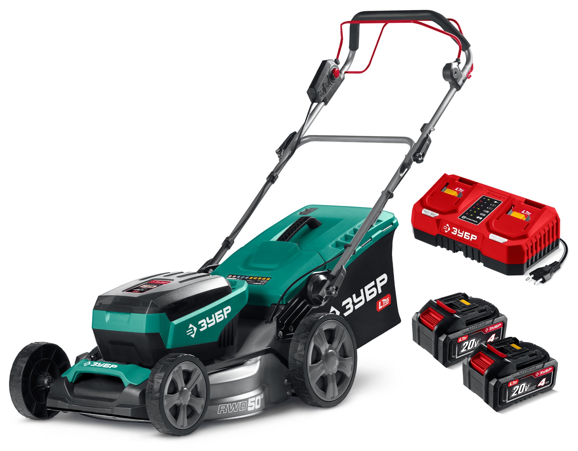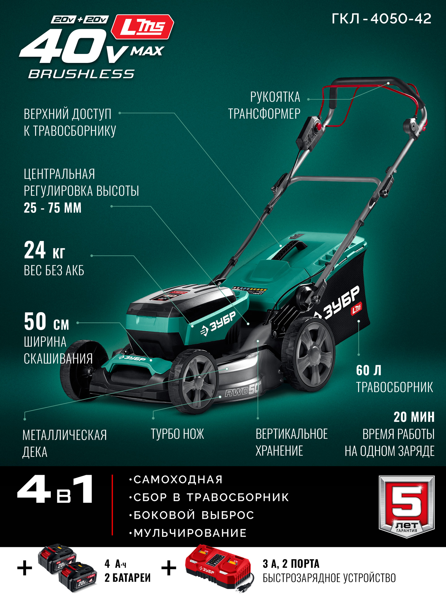 Принадлежности для ЗУБР 40 В (2x20В), 500 мм, 2 АКБ LMS (4 Ач), самоходная газонокосилка аккумуляторная бесщеточная (ГКЛ-4050-42):