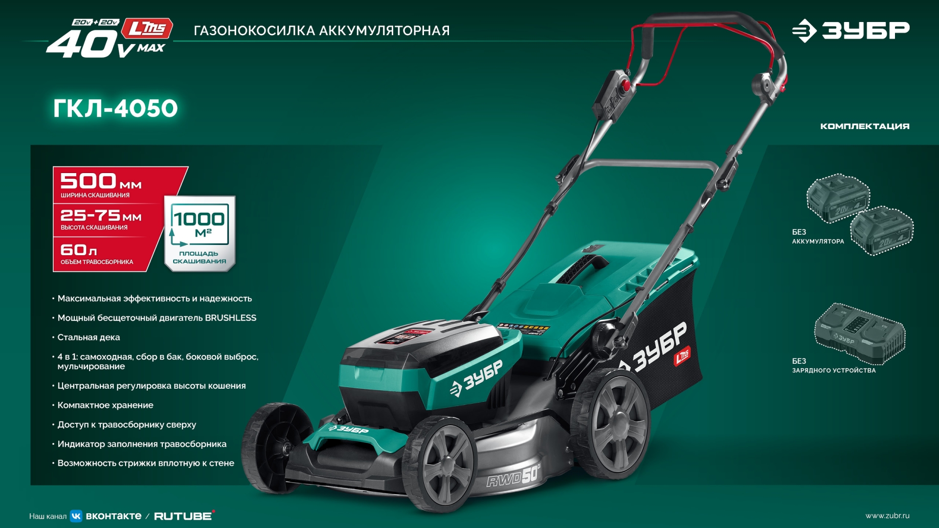 Принадлежности для ЗУБР 40 В (2x20В), 500 мм, без АКБ (LMS), самоходная газонокосилка аккумуляторная бесщеточная (ГКЛ-4050):