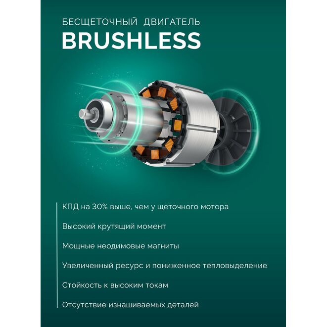 - Бесщеточный двигатель BRUSHLESS обладает рядом преимуществ по сравнению с обычным щеточным двигателем: