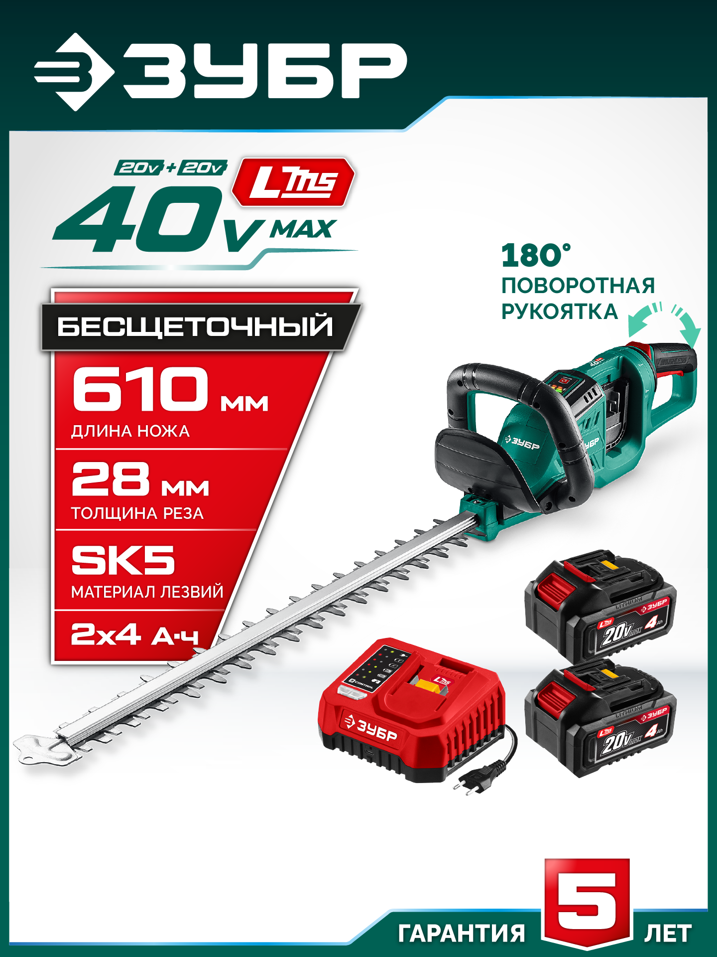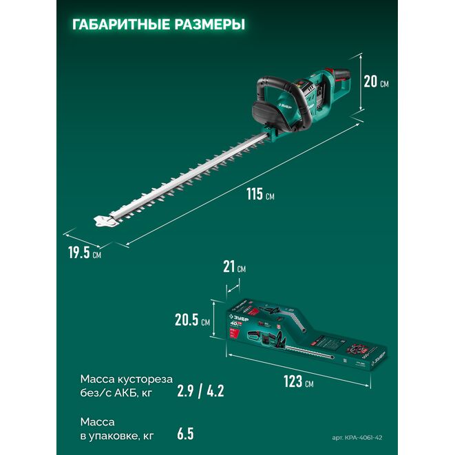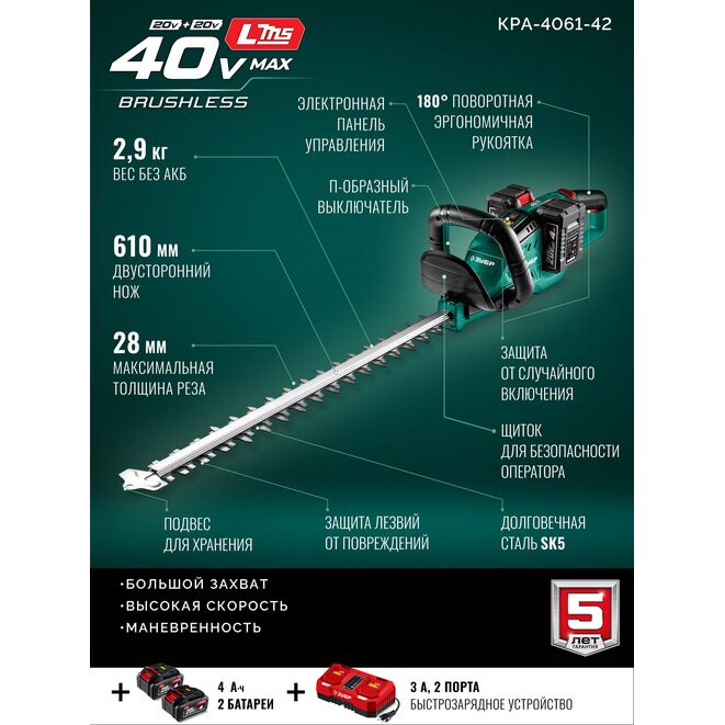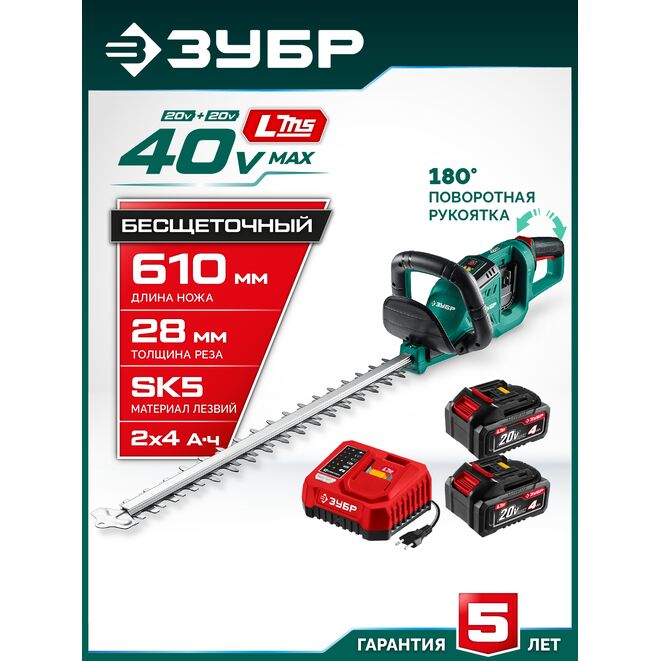 ЗУБР 40 В (2x20В), 610 мм, 2 АКБ LMS (4 Ач), кусторез аккумуляторный бесщеточный (КРА-4061-42)