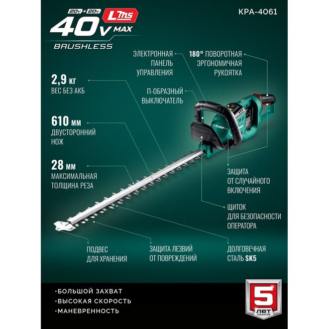 ЗУБР 40 В (2x20В), 610 мм, без АКБ (LMS), кусторез аккумуляторный бесщеточный (КРА-4061)