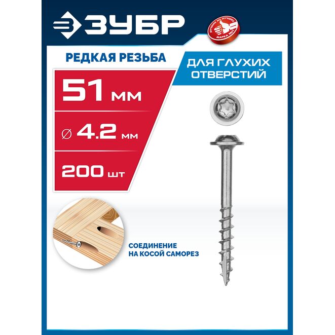 ЗУБР 51 х 4.2 мм, редкая резьба, ТХ20, цинк, 200 шт, саморез для глухих отверстий, Профессионал (30081-42-051)