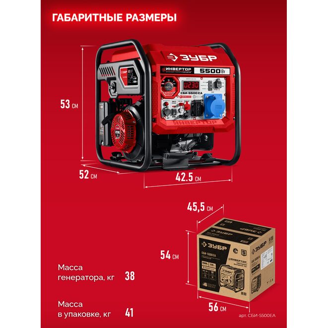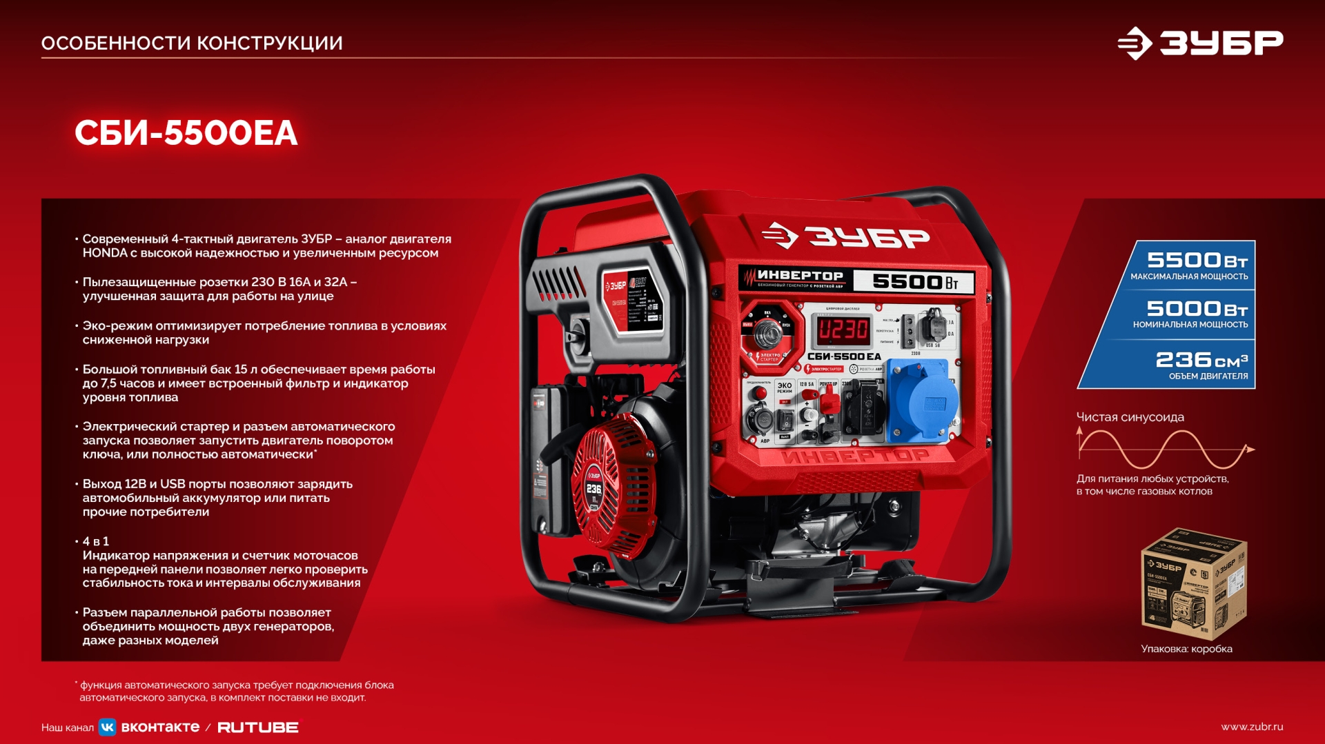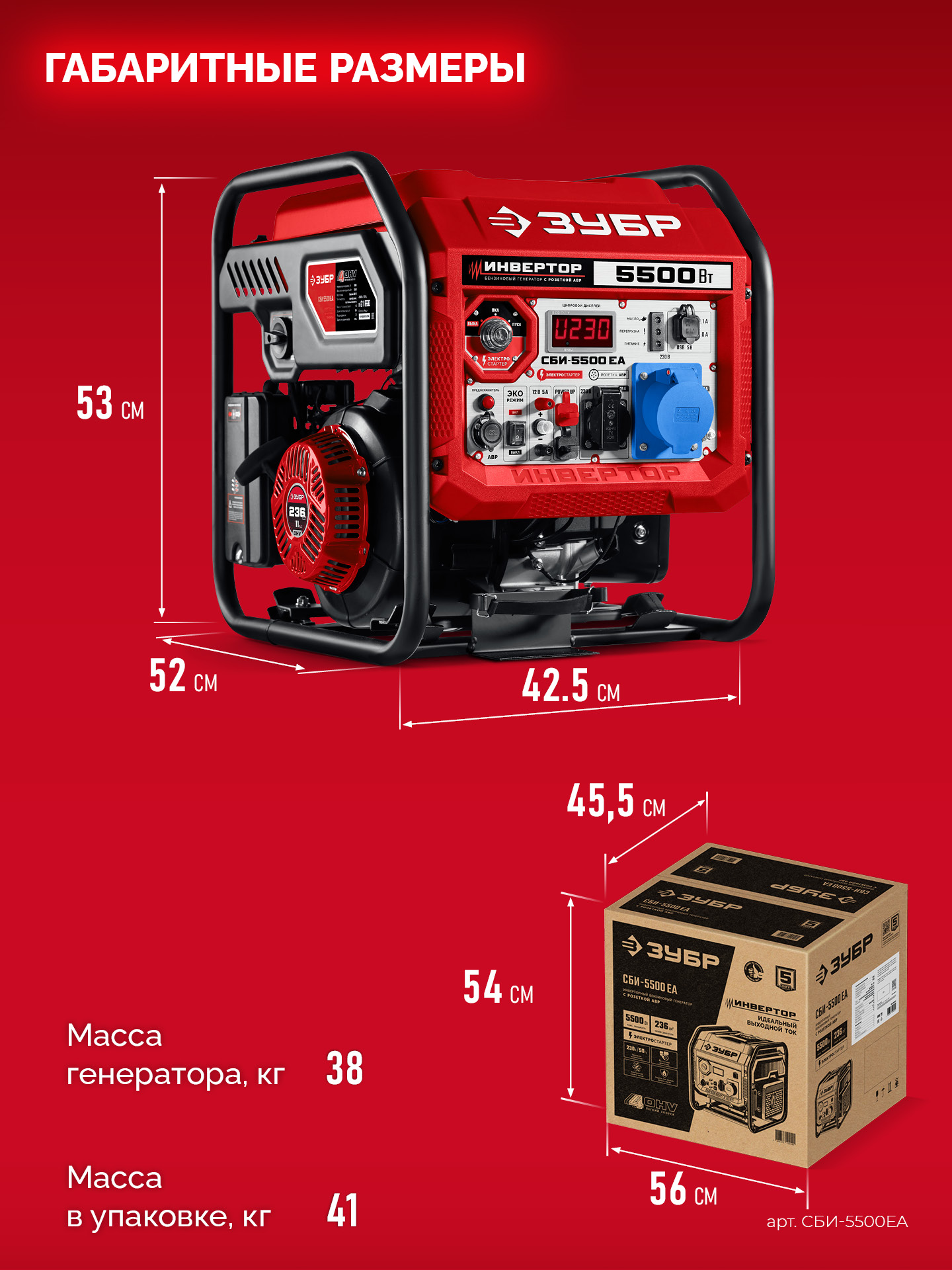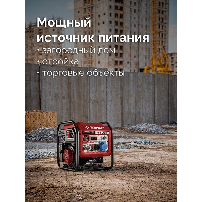 Бензиновый инверторный электрогенератор ЗУБР СБИ-5500ЕА, предназначен для обеспечения электрической энергией потребителей в отсутствии электросети, а также для использования в качестве резервного или аварийного источника электроэнергии.Характеристики ЗУБР СБИ-5500ЕА: