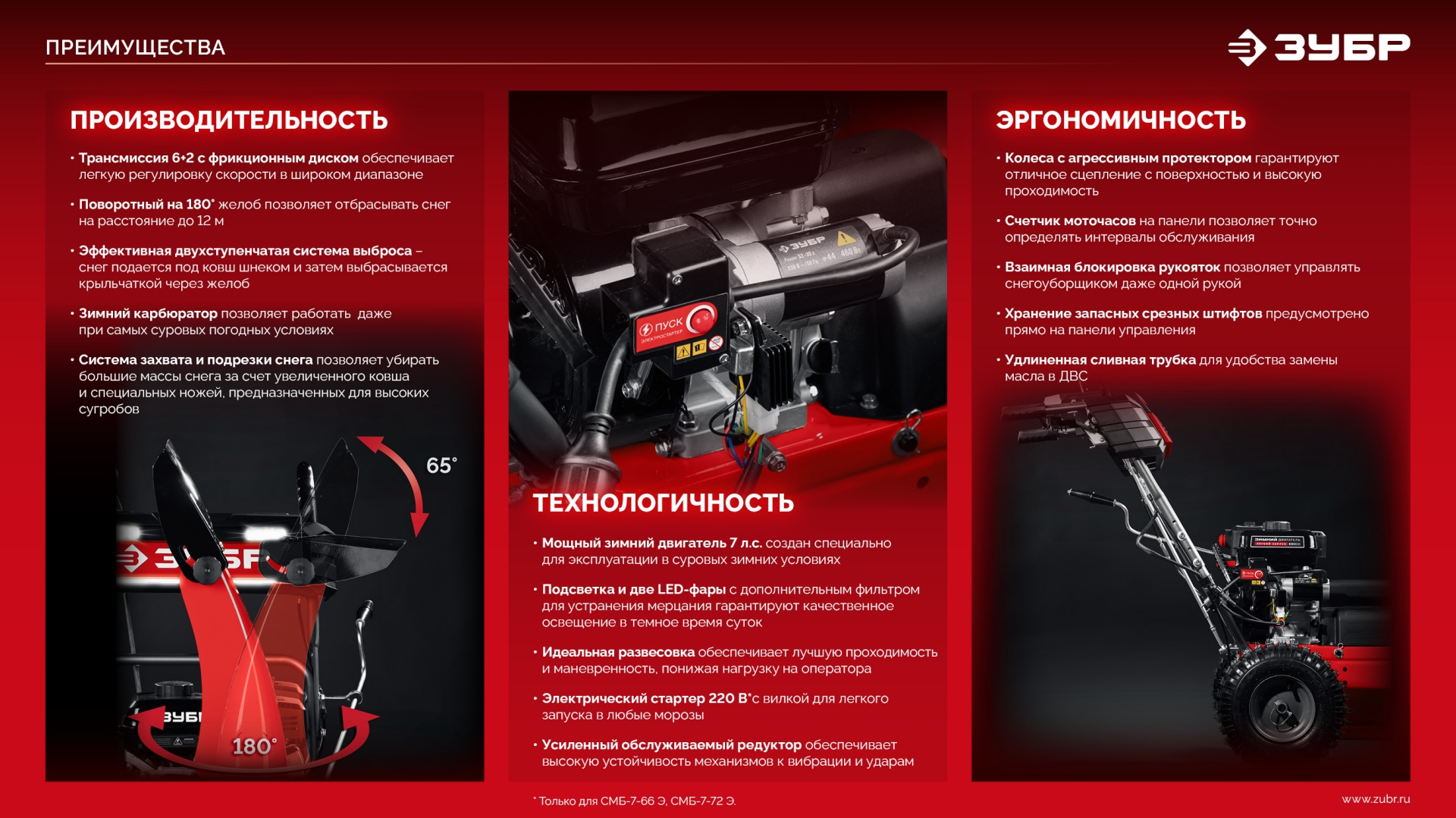Компактный и мощный снегоуборщик ЗУБР идеально подходит для быстрой и эффективной очистки подъездных и пешеходных дорожек от снега. Оснащён зимним четырехтактным двигателем WINTER PRO, специально разработанным для работы в самых суровых зимних условиях.Применение