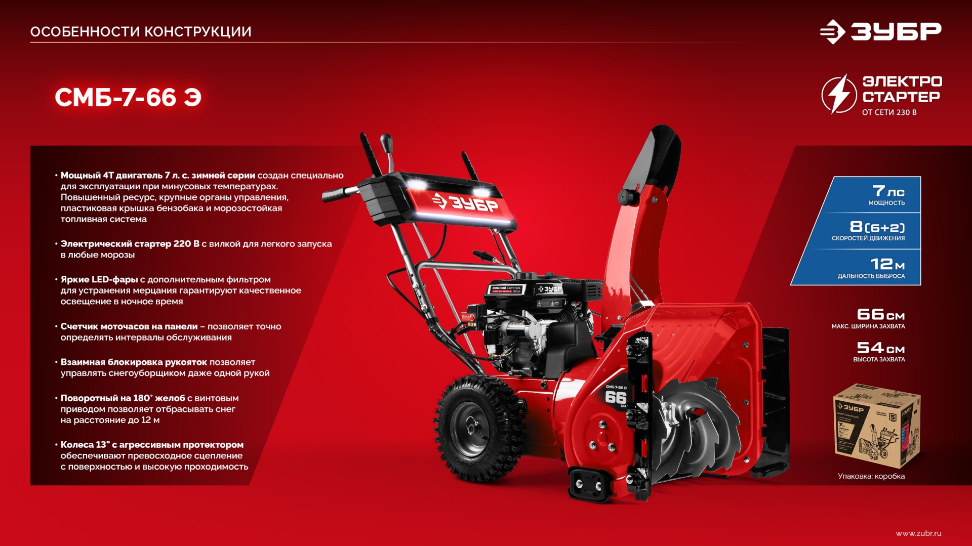 Бензиновый снегоуборщик ЗУБР СМБ-7-66 Э, предназначен для уборки снега с полей, дорог, тротуаров и проездов. Эксплуатация на склонах с уклоном более 20 градусов запрещена. Запрещается использовать изделие на участках с большим количеством мусора, грязи и выступающих камней.Характеристики ЗУБР СМБ-7-66 Э: