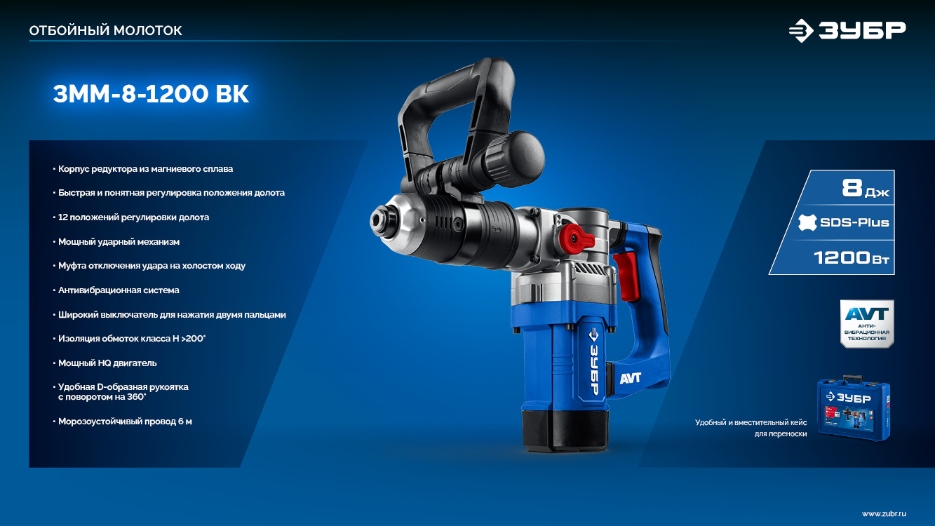 ЗУБР 8 Дж, 1200 Вт, АВТ, отбойный молоток SDS Plus, Профессионал (ЗММ-8-1200 ВК)