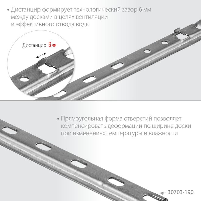 - Дистанцир формирует зазор 6 мм между досками. Зазор необходим для вентиляции покрытия и его устойчивости к температурным колебаниям.