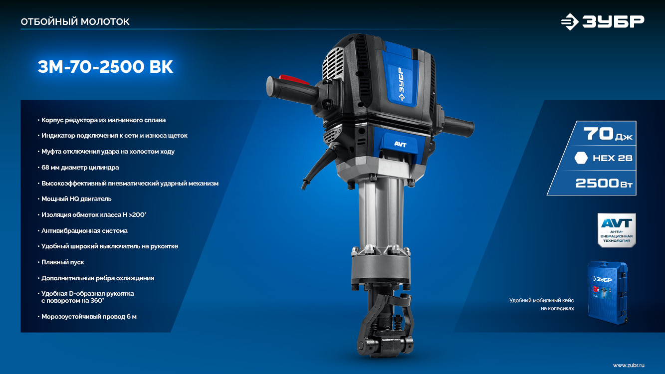 Молоток отбойный (бетонолом) ЗУБР ЗМ-70-2500 ВК предназначен для разрушения конструкций из бетона, железобетона, кирпича и камня, долбления асфальтовых, бетонных и плиточных покрытий, уплотненного грунта и других строительных работ.Характеристики ЗУБР ЗМ-70-2500 ВК: