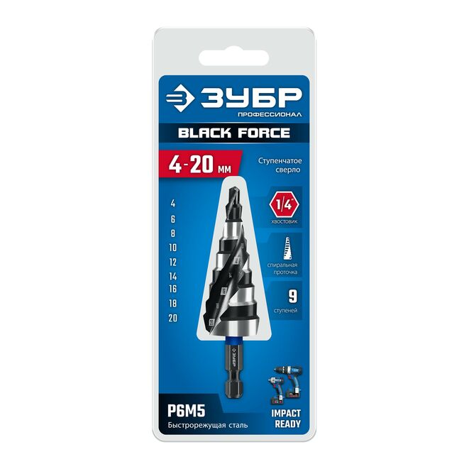 ЗУБР BLACK FORCE 4-20 мм, 9 ступеней, винтовая проточка, сверло ступенчатое, Профессионал (29671-4-20-9)