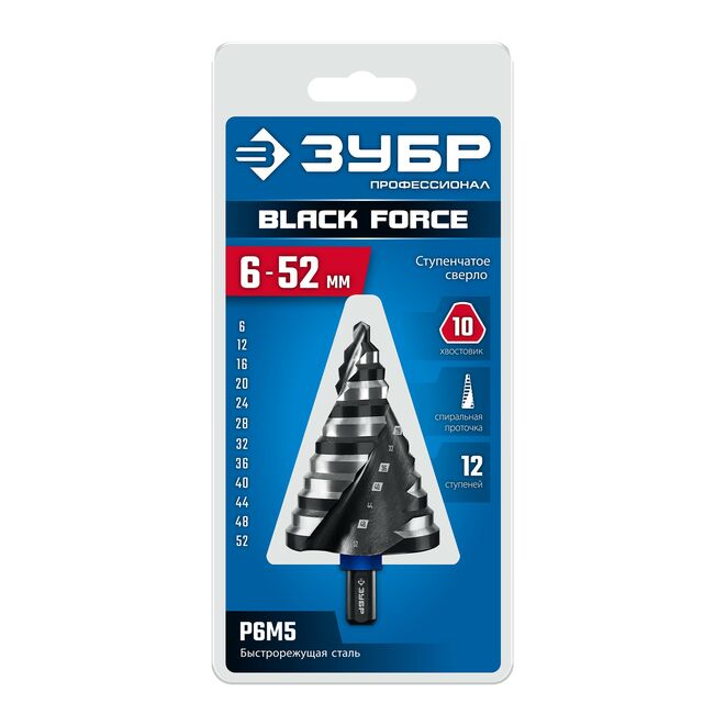 ЗУБР BLACK FORCE 6-52 мм, 12 ступеней, винтовая проточка, сверло ступенчатое, Профессионал (29671-6-52-12)