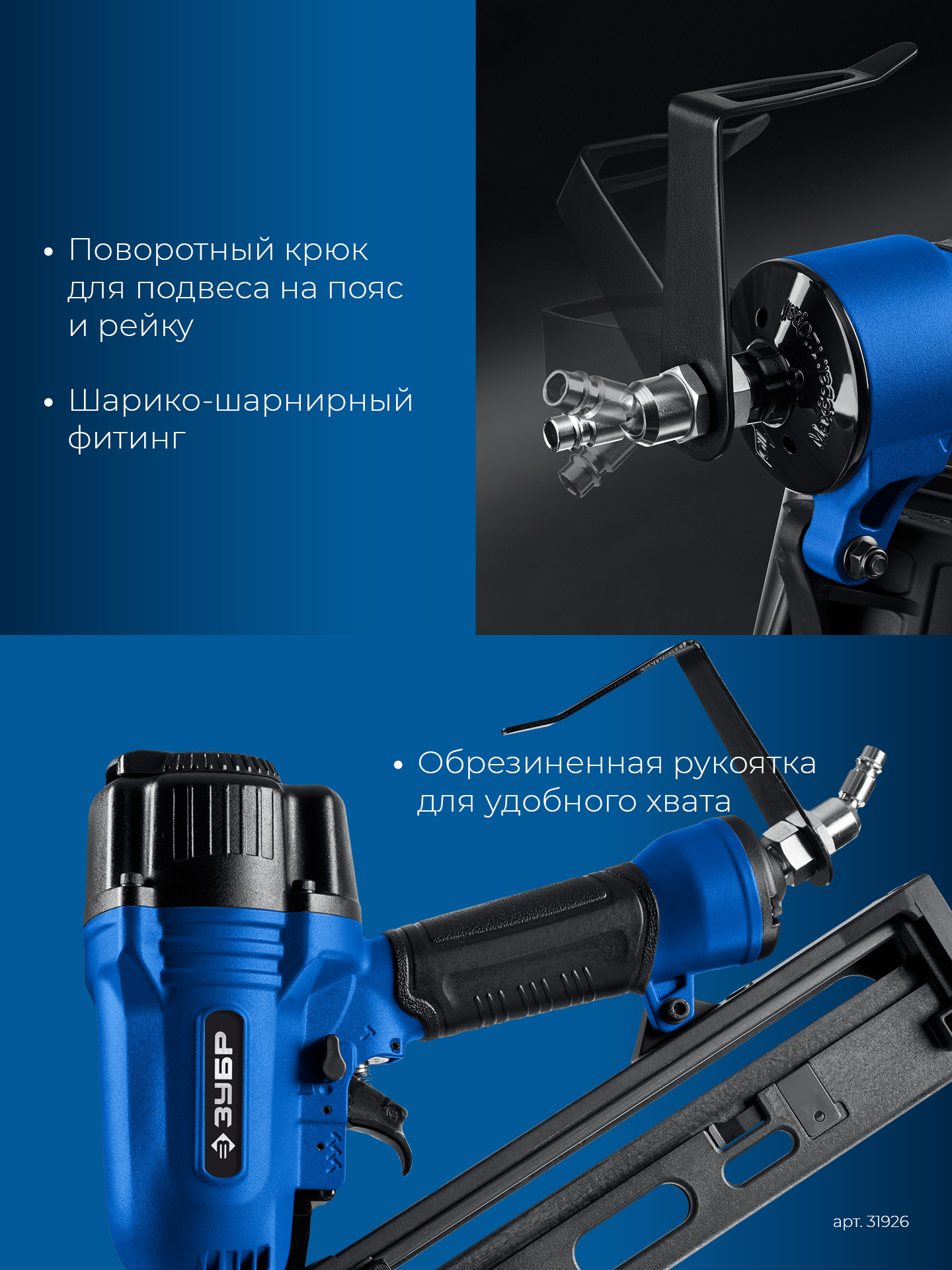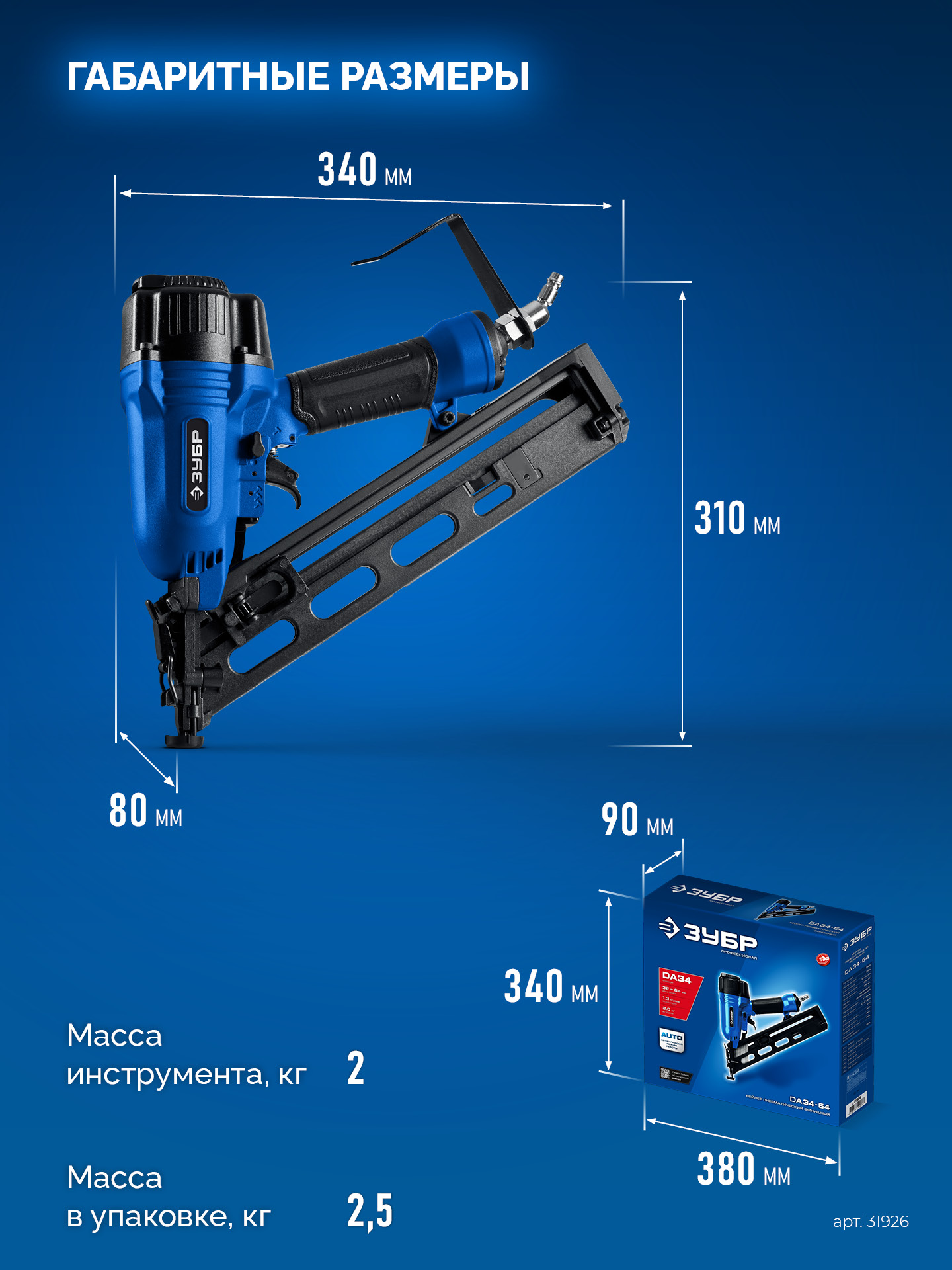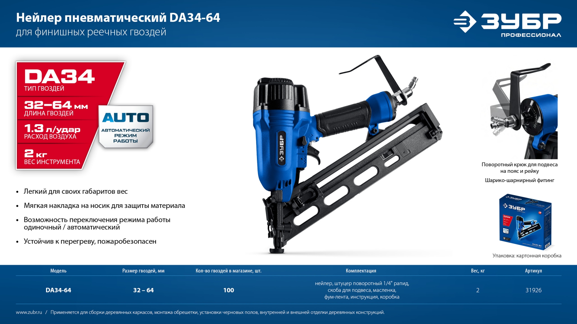 Нейлер (гвоздезабиватель) пневматический для реечных гвоздей ЗУБР DA34-64, предназначен для cборки деревянных каркасов, монтажа обрешетки, установки черновых полов, внутренней и внешней отделки деревянных конструкций.Характеристики ЗУБР 31926: