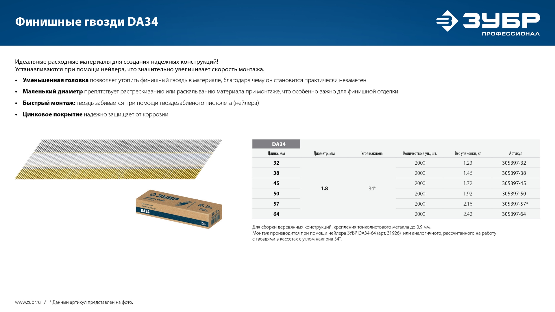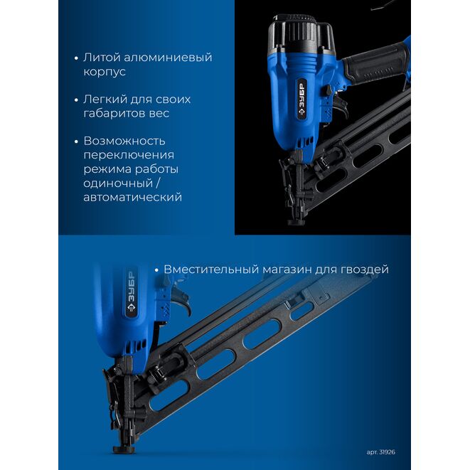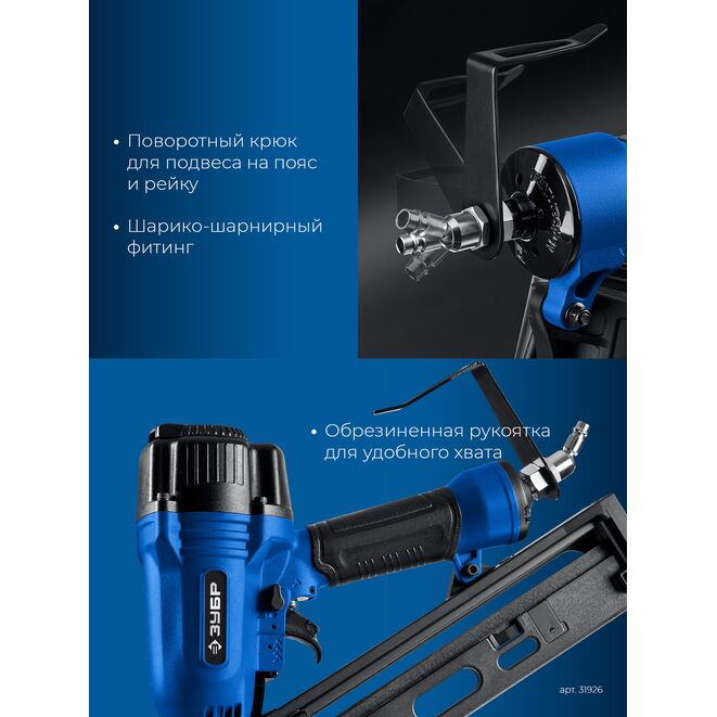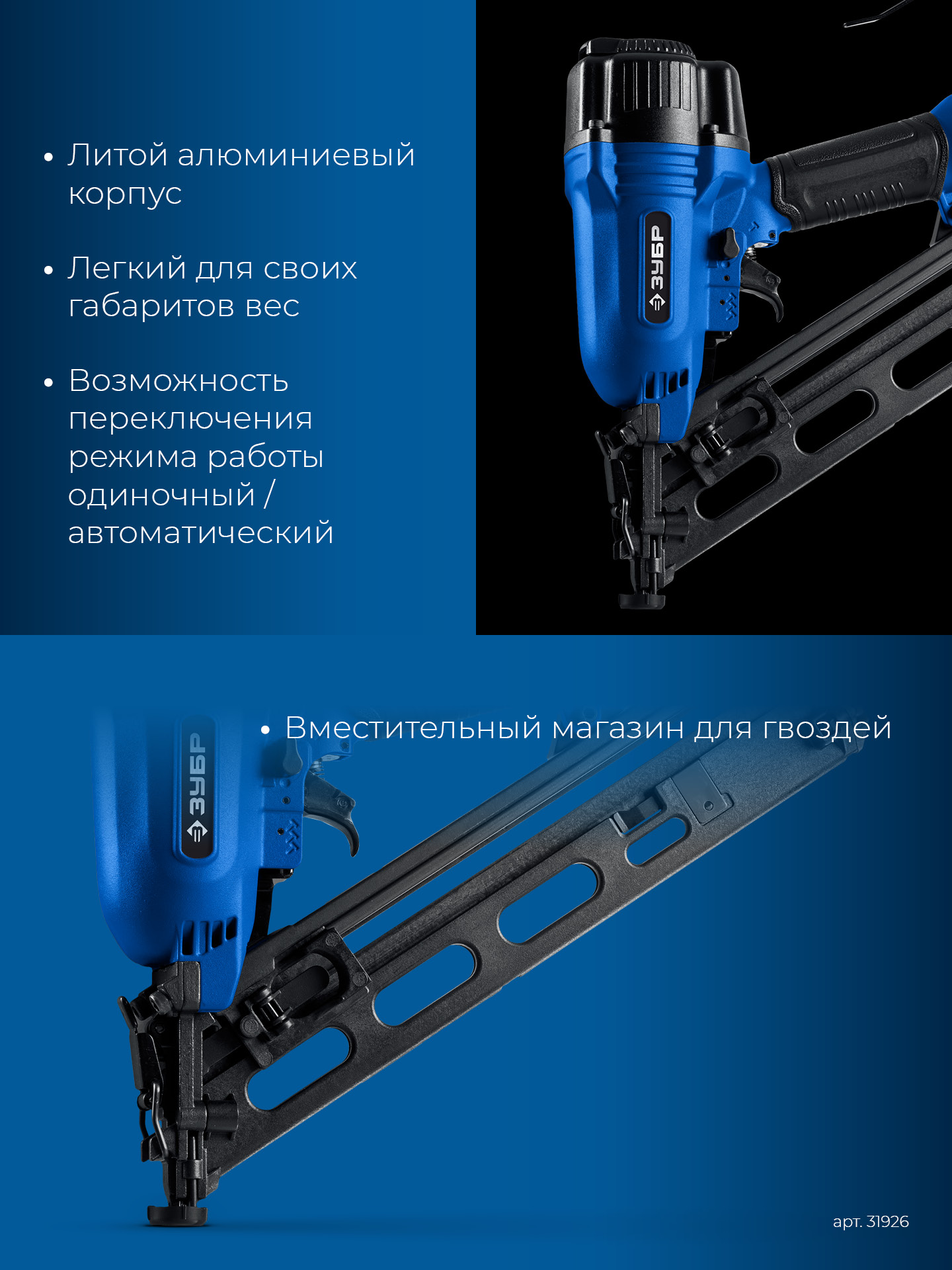 Нейлер (гвоздезабиватель) пневматический для реечных гвоздей ЗУБР DA34-64, предназначен для cборки деревянных каркасов, монтажа обрешетки, установки черновых полов, внутренней и внешней отделки деревянных конструкций.Характеристики ЗУБР 31926: