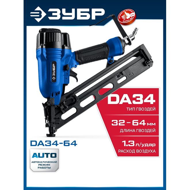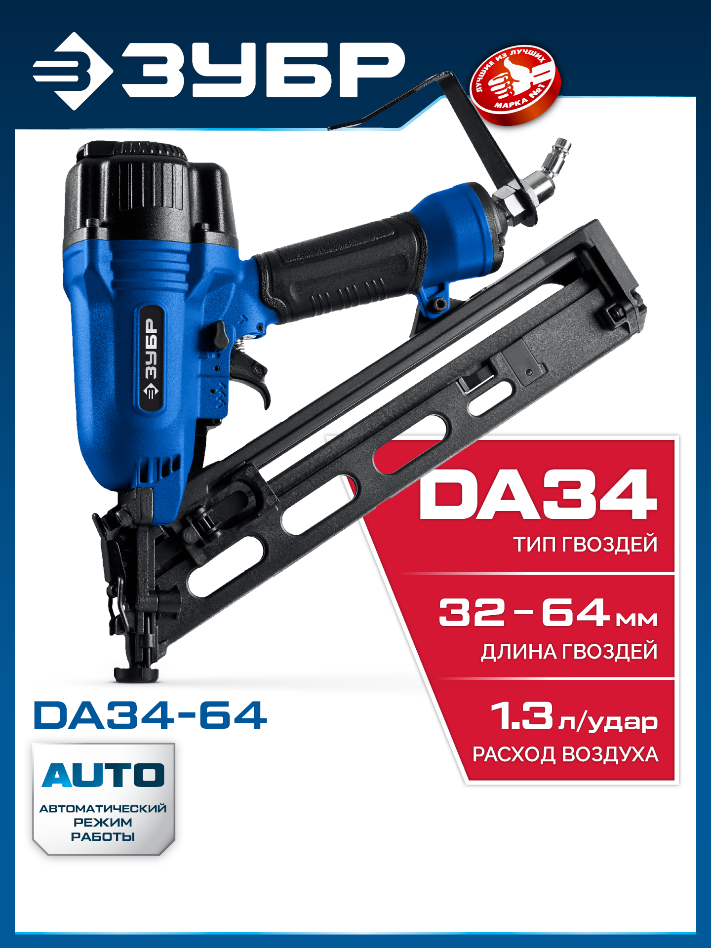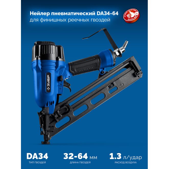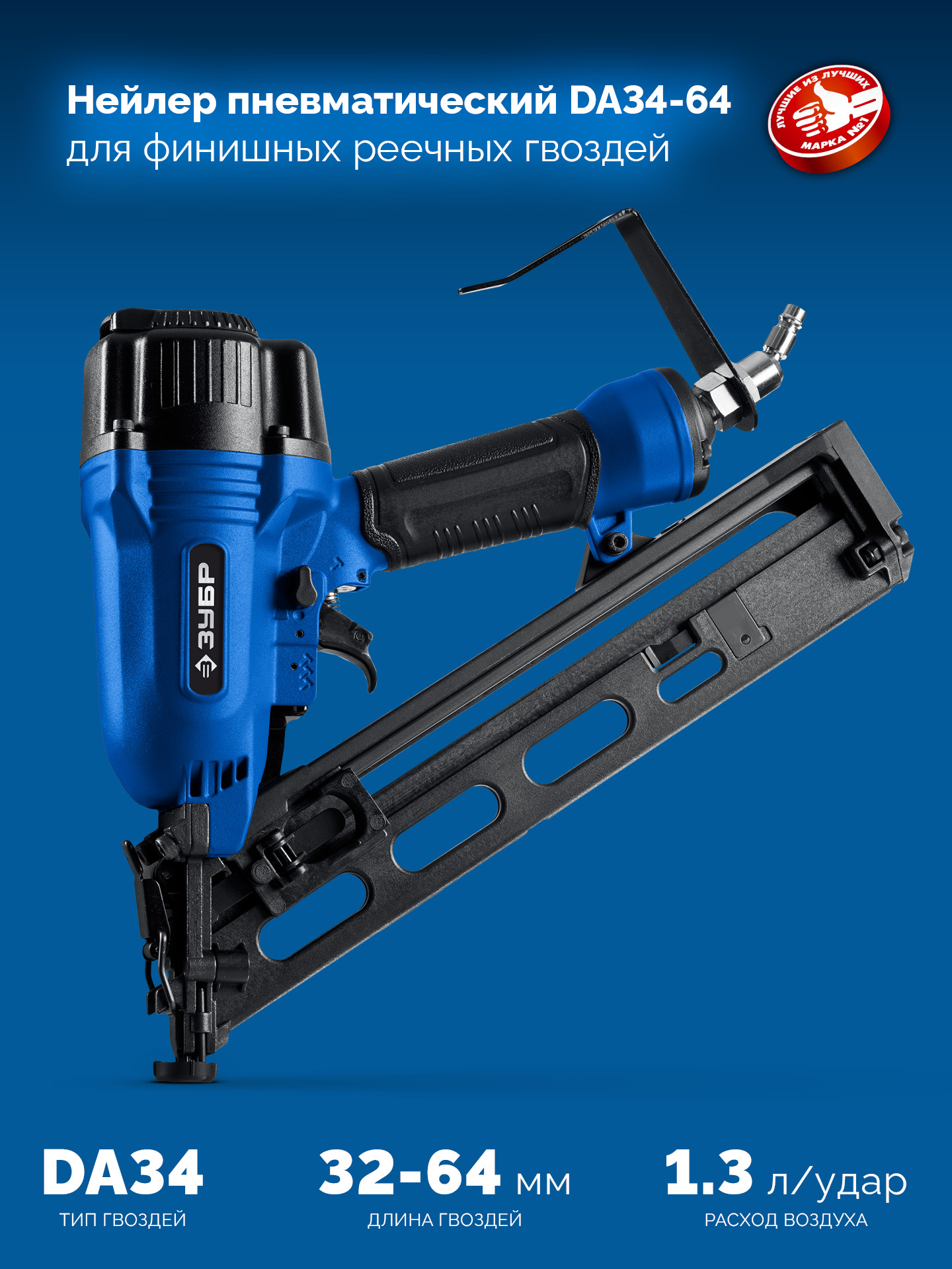 ЗУБР DA34-64, пневматический финишный нейлер для реечных гвоздей ЗУБР 15Ga, DA34 (32-64 мм) Профессионал (31926)