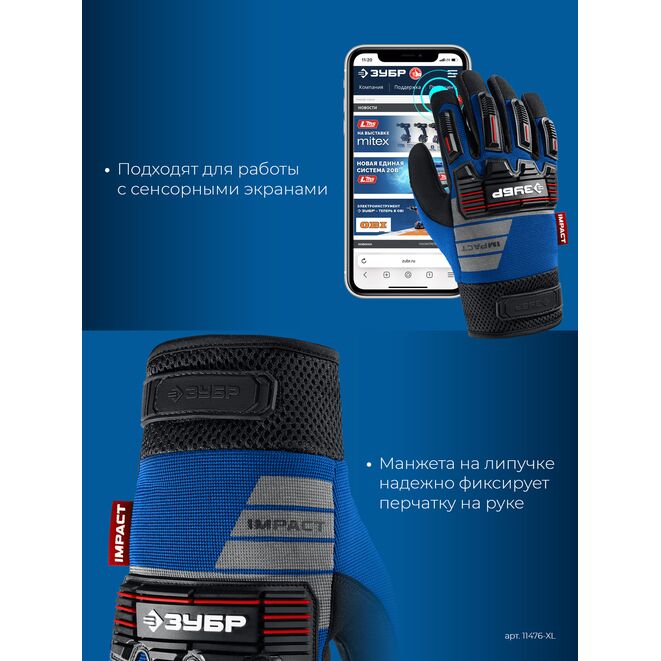 ЗУБР IMPACT р.L (9), синие, профессиональные комбинированные перчатки, антивибрационные, противоударные, Профессионал (11476-L)