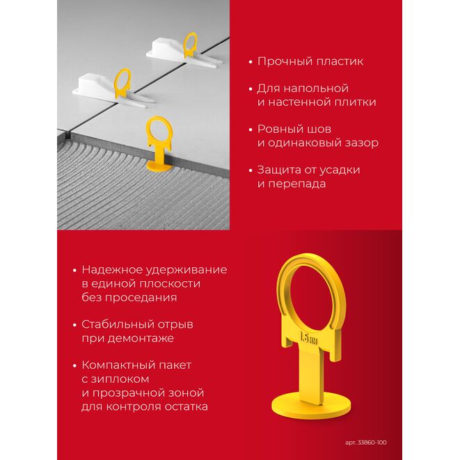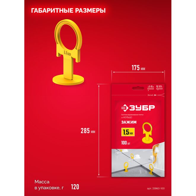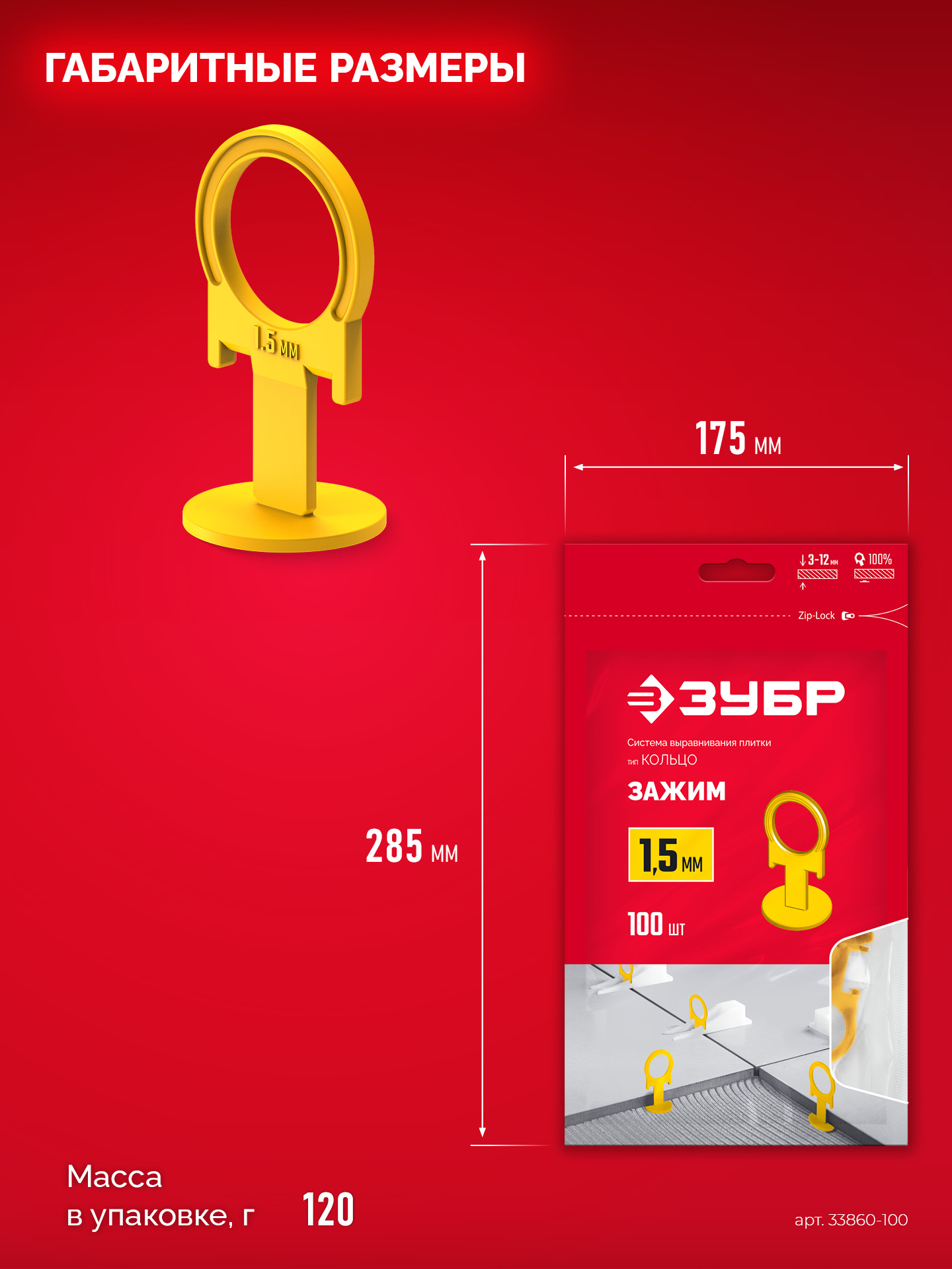 ЗУБР КОЛЬЦО, 1,5 мм, зажим, 100 шт, система выравнивания плитки (33860-100)