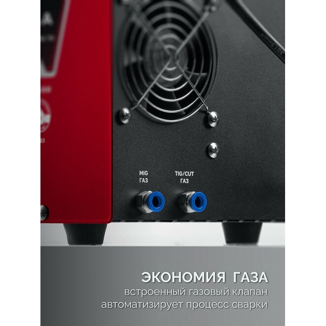 5-в-1. Максимально универсальный сварочный полуавтомат инверторного типа с синергетическим управлением, функцией плазменной резки, цифровым дисплеем и функциями MMA и TIG сварки, позволяющий производить качественную и комфортную сварку и плазменную резку различных сталей как в среде защитного газа, так и самозащитной порошковой проволокой без газа, сварку штучными покрытыми электродами и сварку неплавящимся электродом в среде инертного газа. Современные электронные компоненты, автоматический подбор сварочных параметров позволят с легкостью провести все необходимые сварочные работы в быту, автомастерской или на стройплощадке.Применение