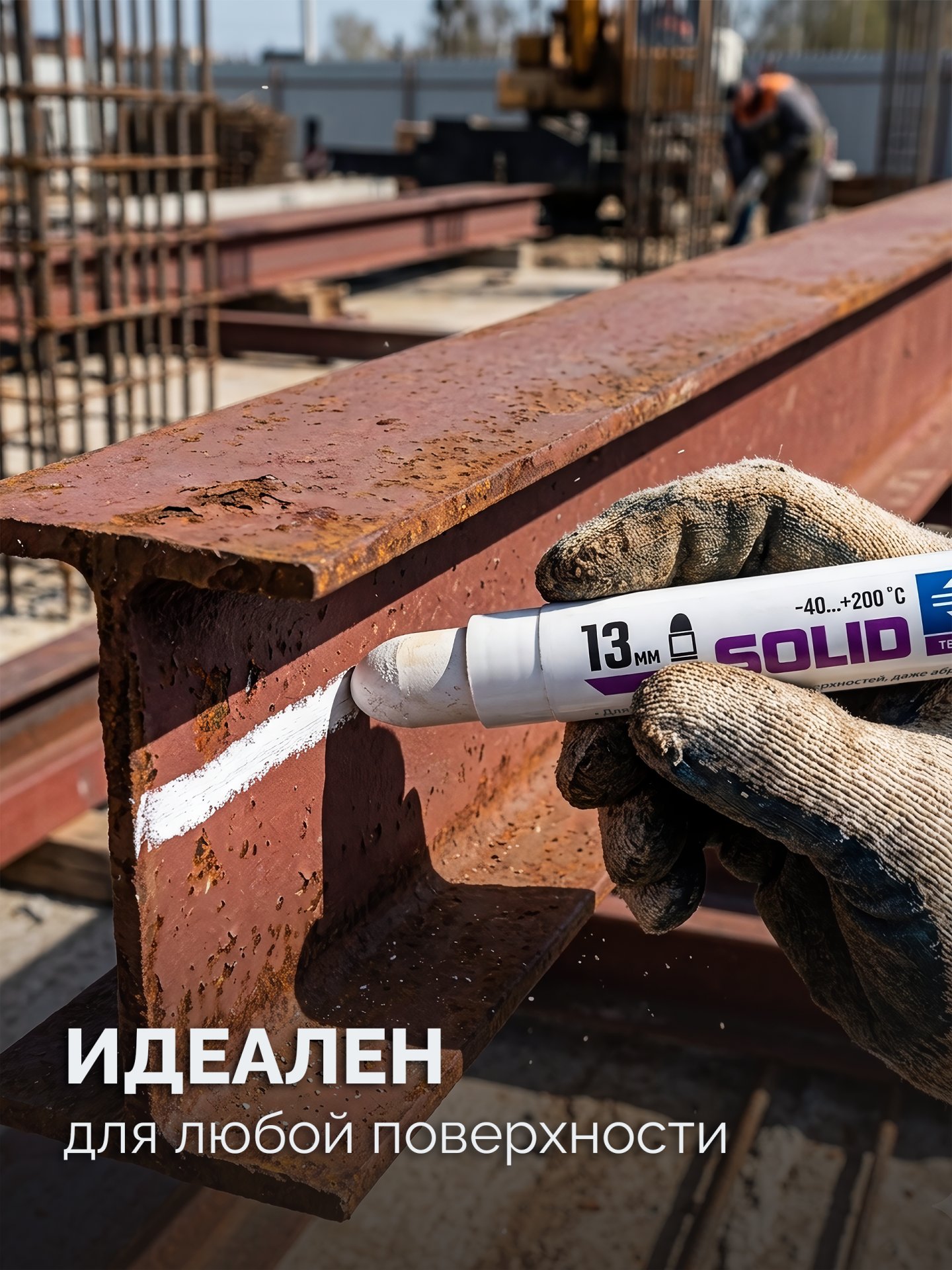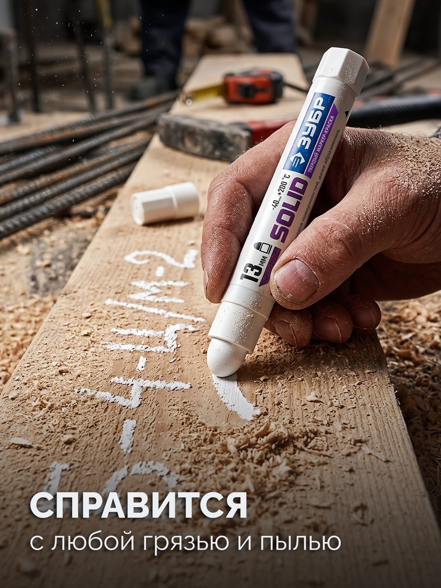 Маркер-краска твердый - профессиональный иснтрумент для разметки по любым поверхностям - гладким, шероховатым и грубым, чистым, пыльным, замаслянным и грязным, по сухим и влажным поверхностям, под дождем, снегом и даже под водой. Пастообразная краска в удобном корпусе. Подача производится механизмом внизу корпуса.Применение