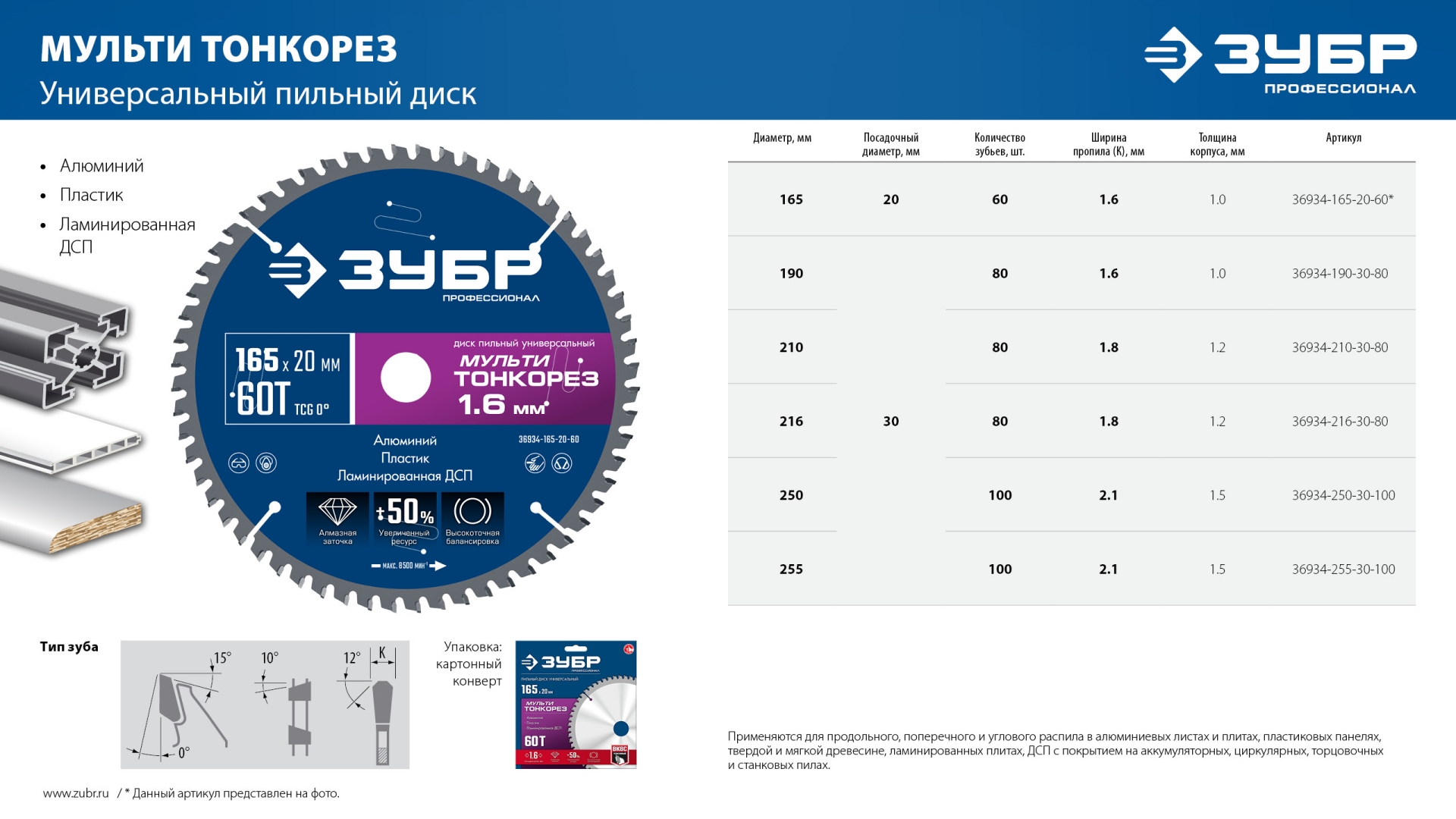 ЗУБР Мульти Тонкорез 165х20 x 1.6 мм, 60Т, диск пильный универсальный, тонкий рез, Профессионал (36934-165-20-60)