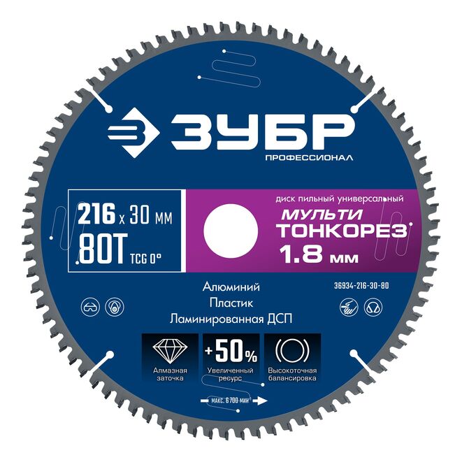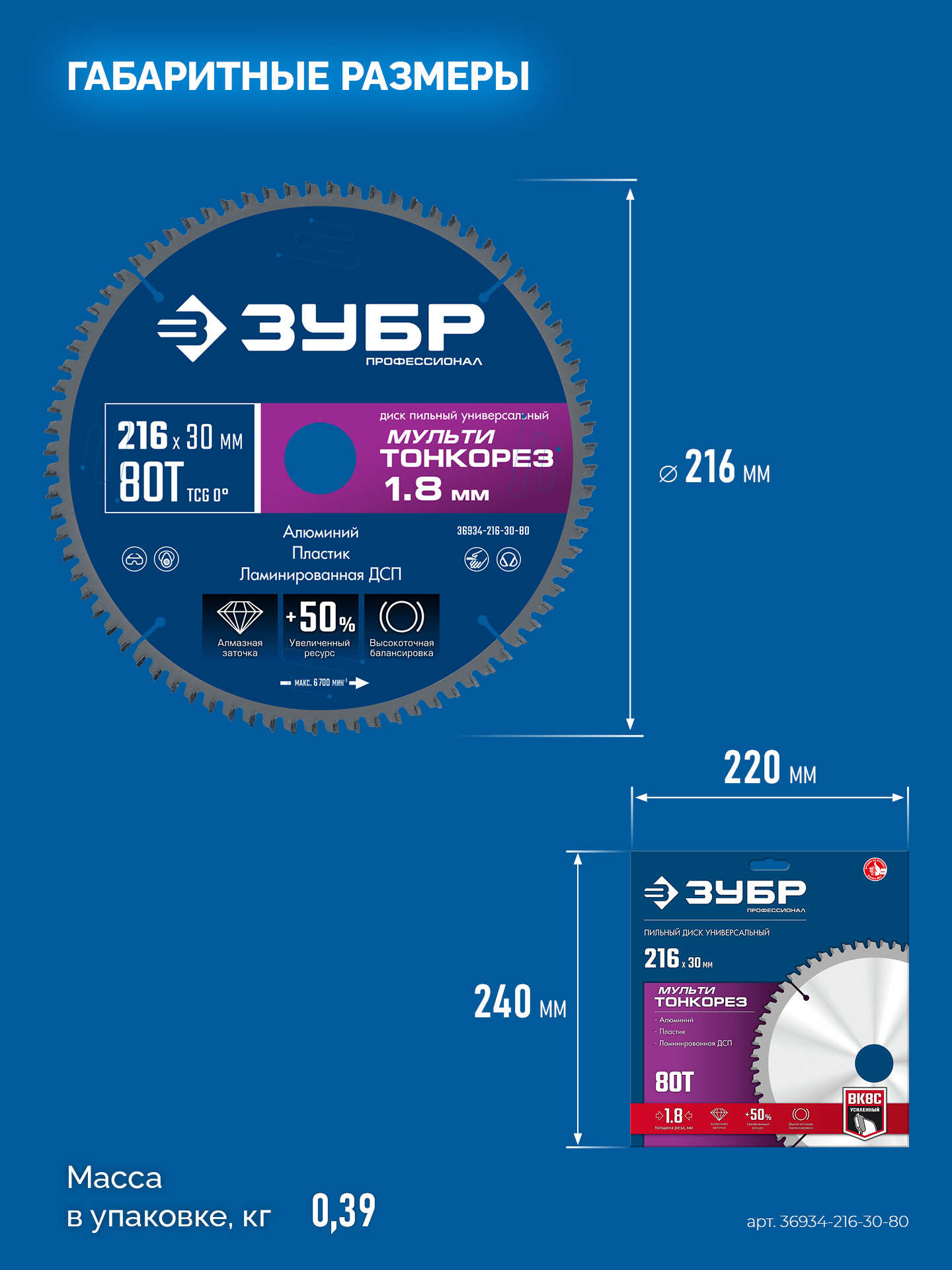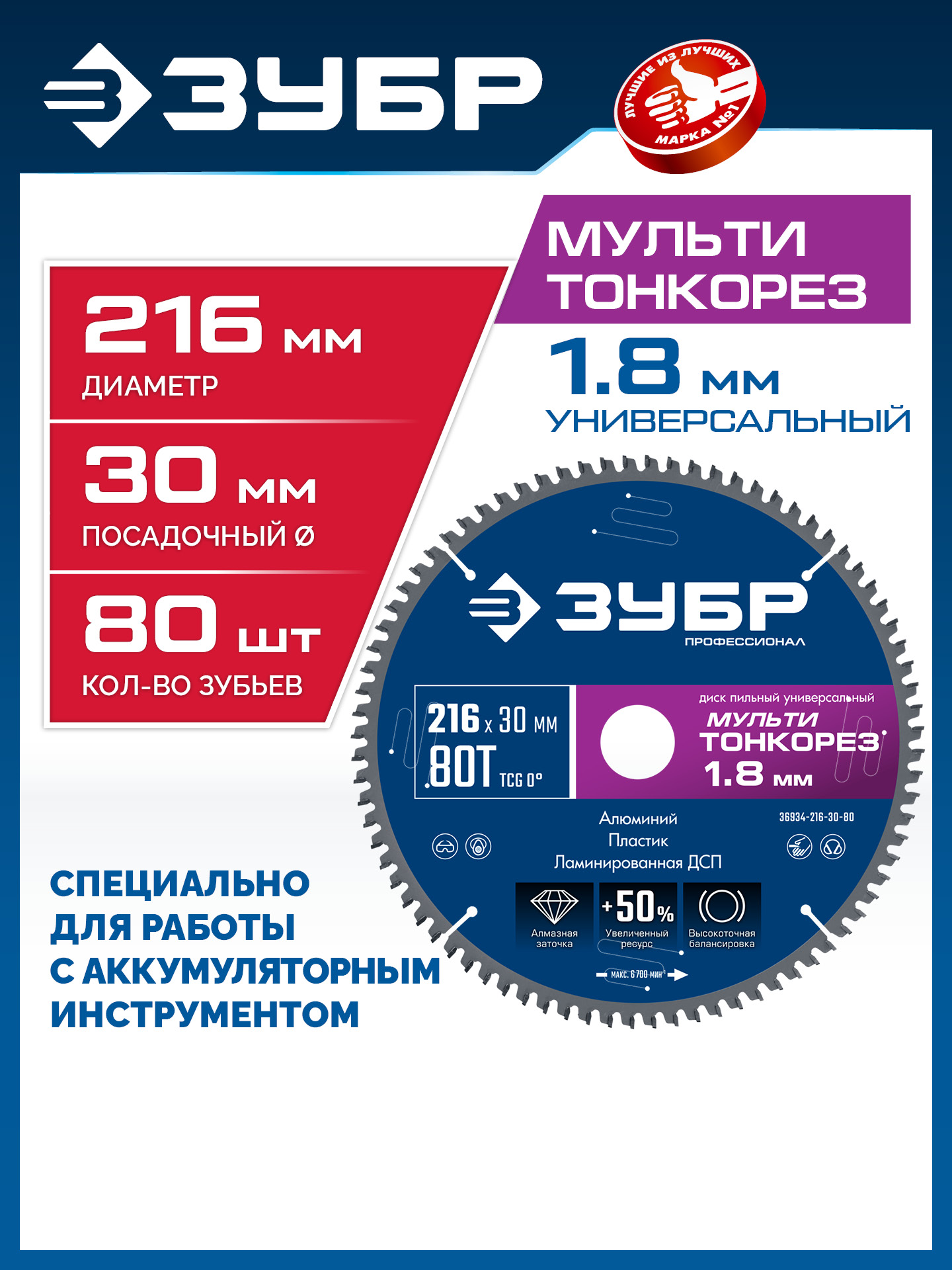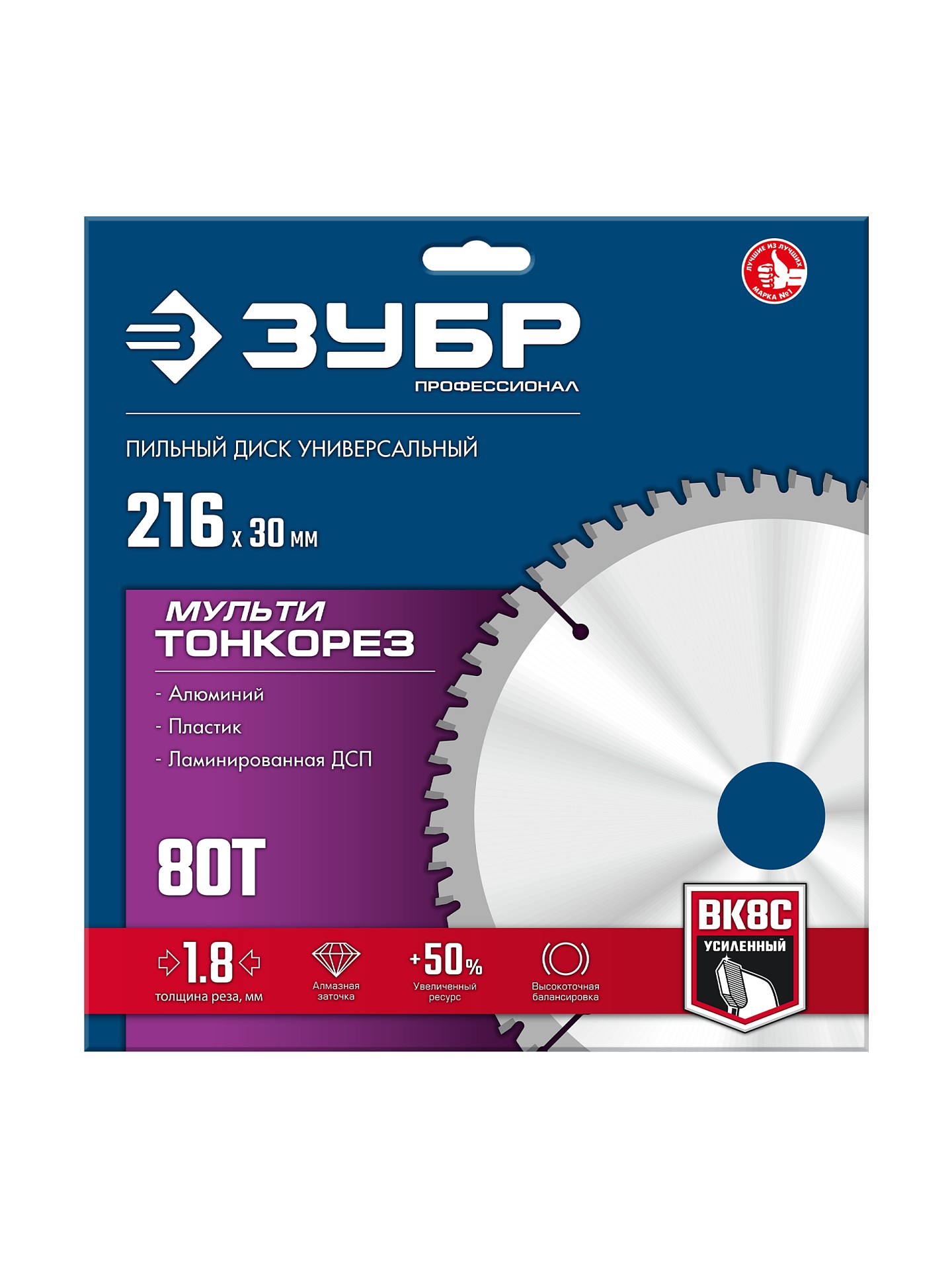 ЗУБР Мульти Тонкорез 216х30 x 1.8 мм, 80Т, диск пильный универсальный, тонкий рез, Профессионал (36934-216-30-80)