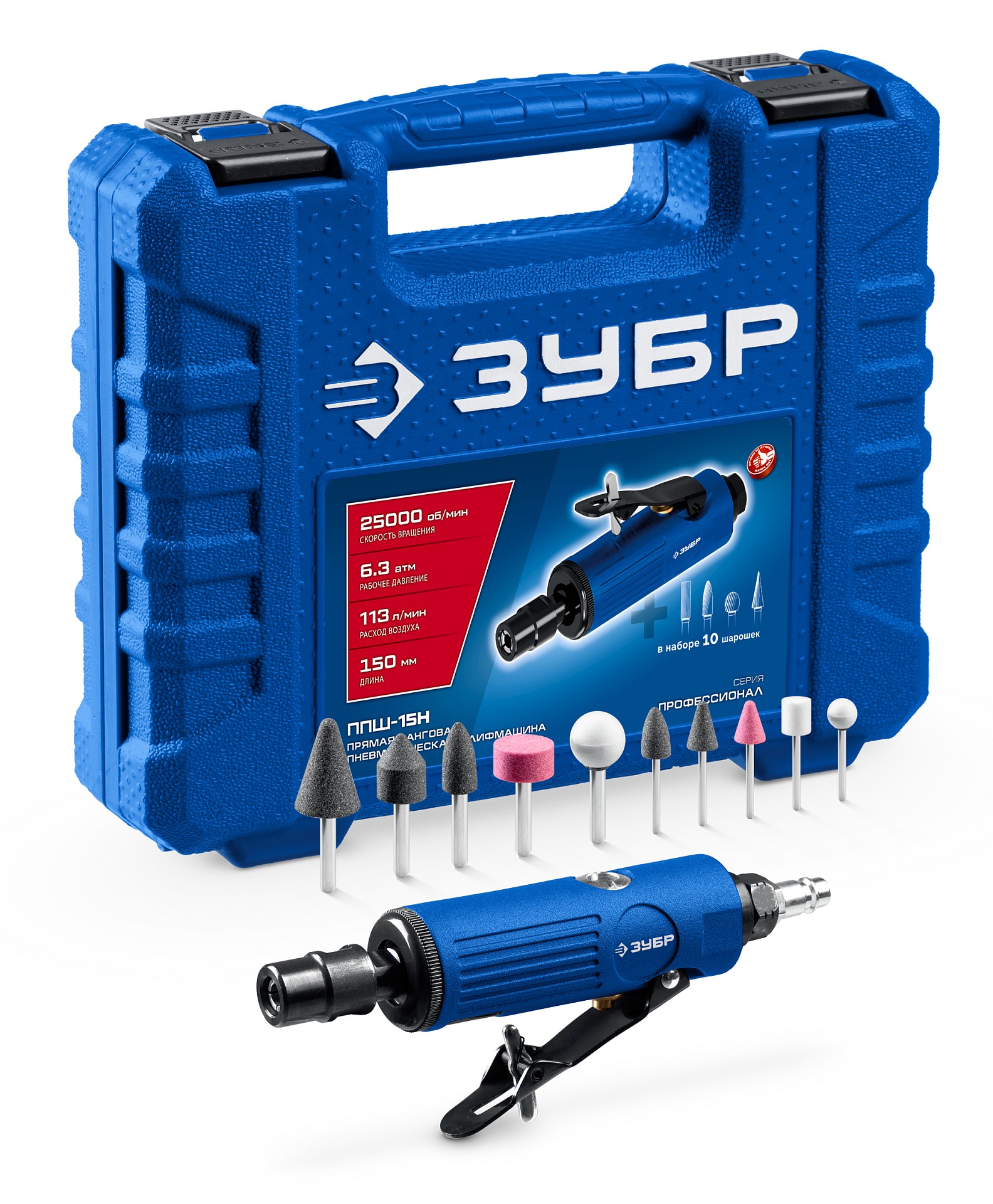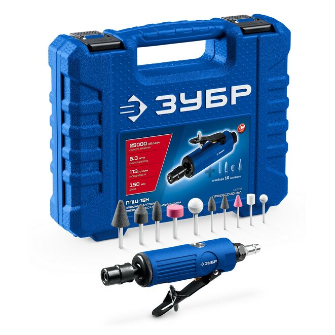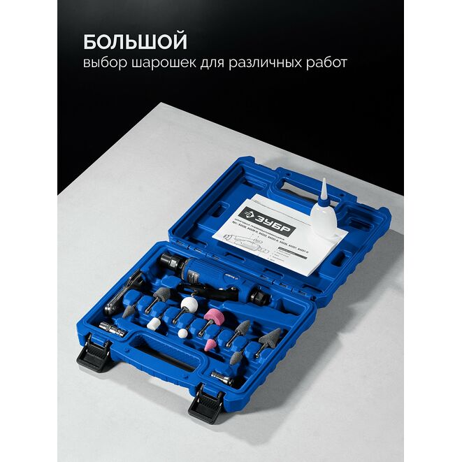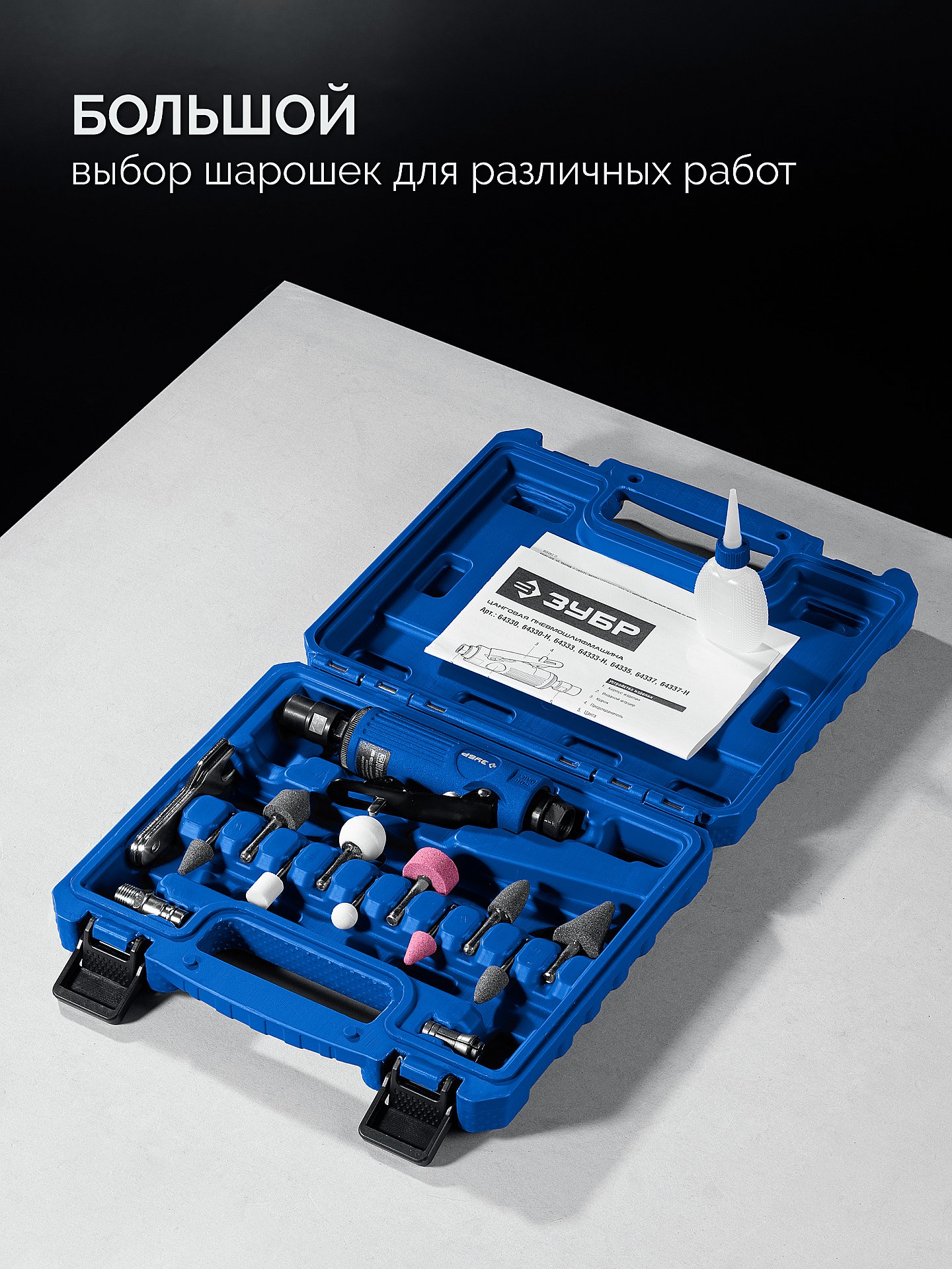 ЗУБР набор в кейсе: прямая цанговая пневмошлифмашина, 10 шарошек и оснастка, ПРОФЕССИОНАЛ (64330-H)