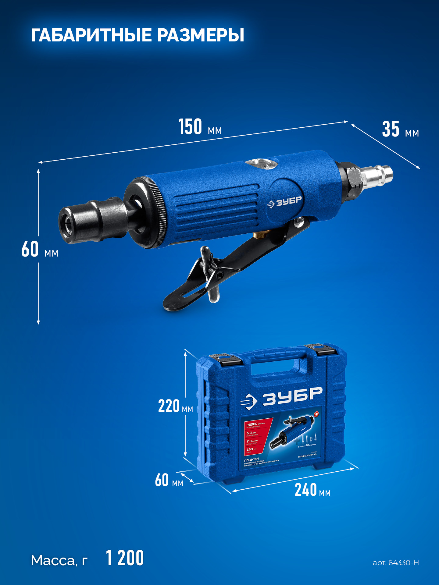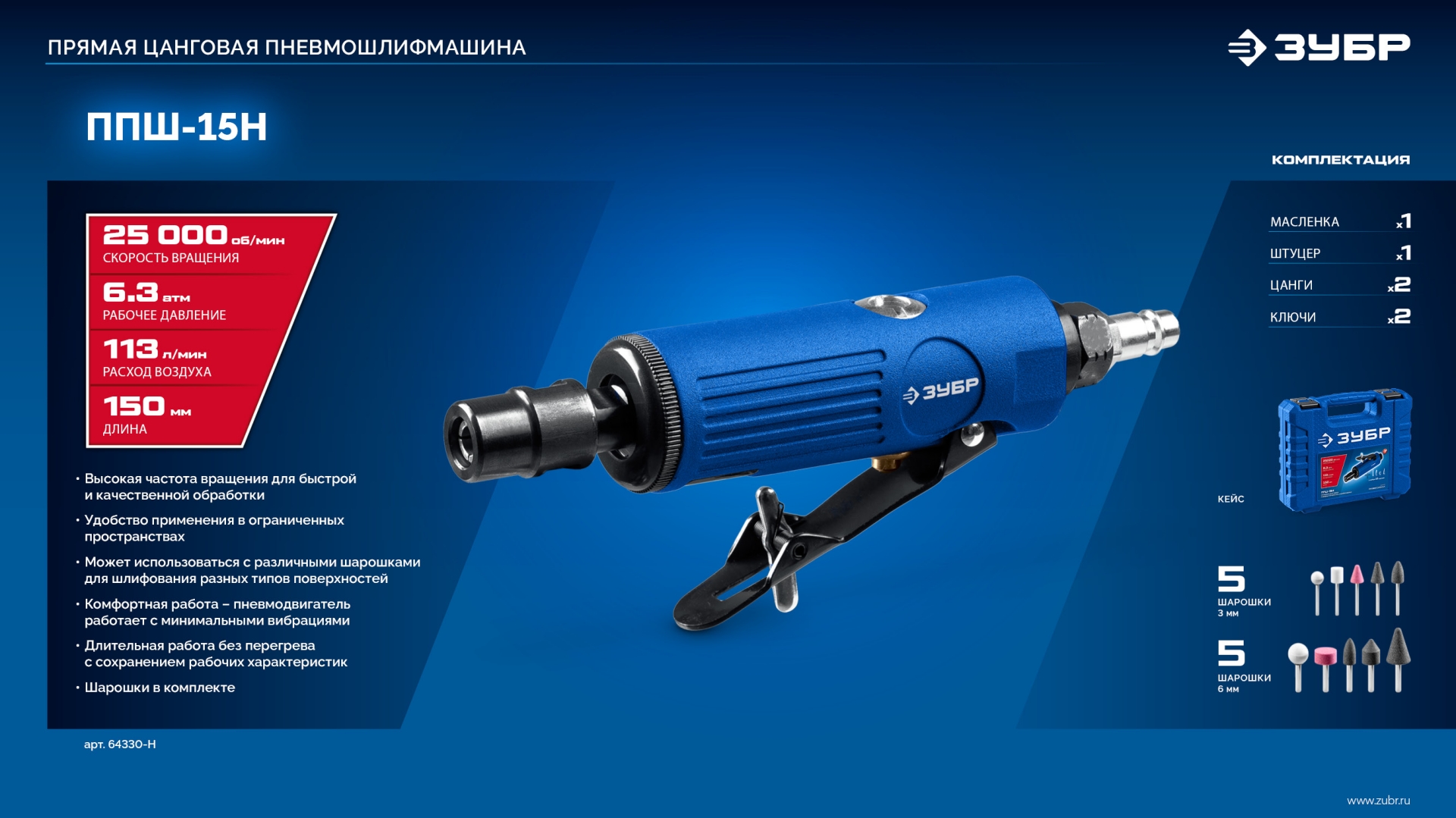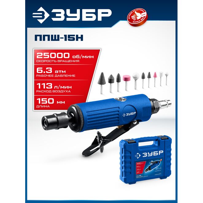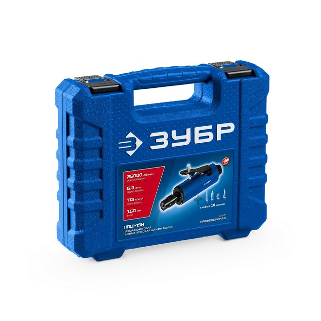 ЗУБР набор в кейсе: прямая цанговая пневмошлифмашина, 10 шарошек и оснастка, ПРОФЕССИОНАЛ (64330-H)