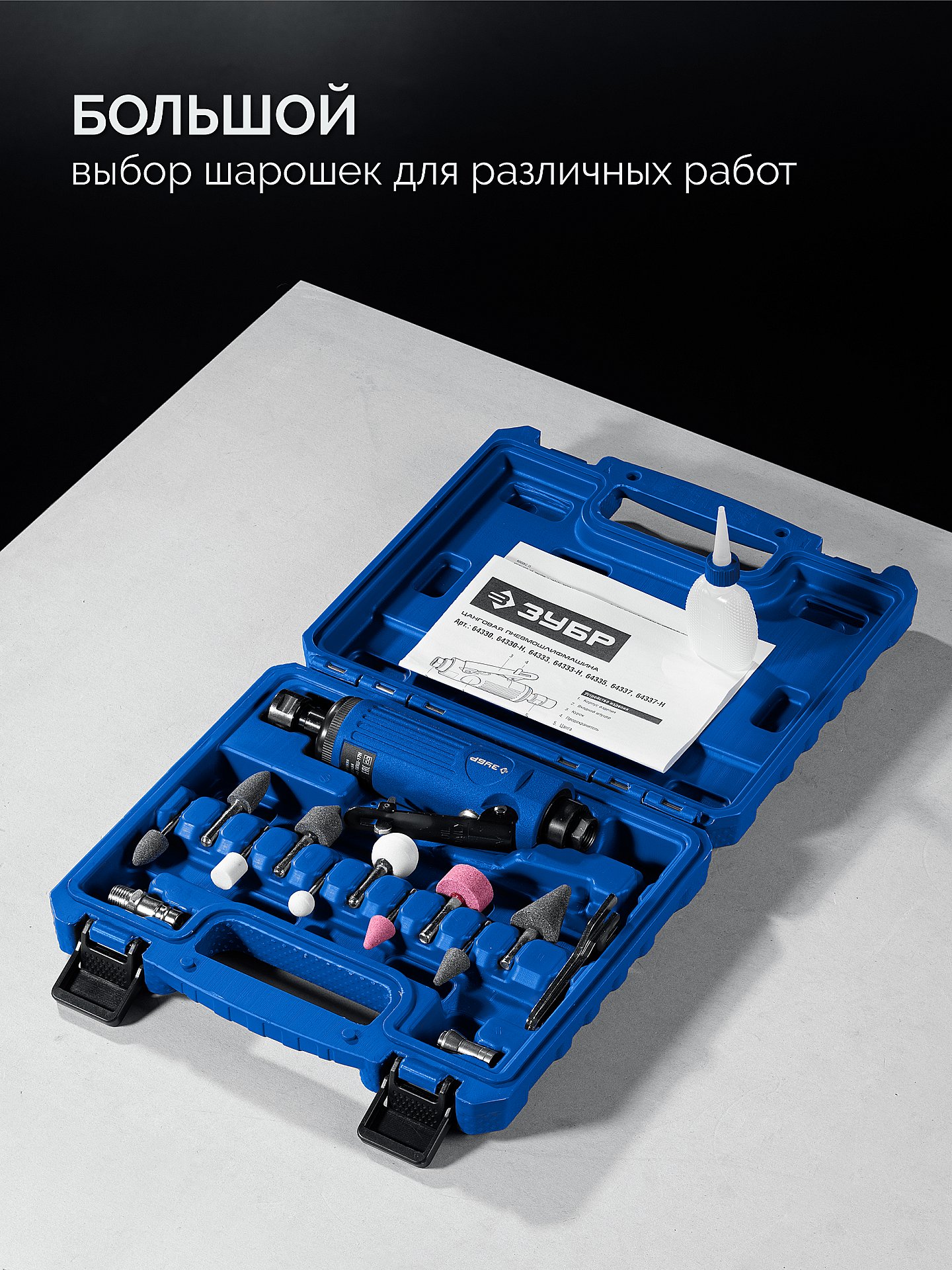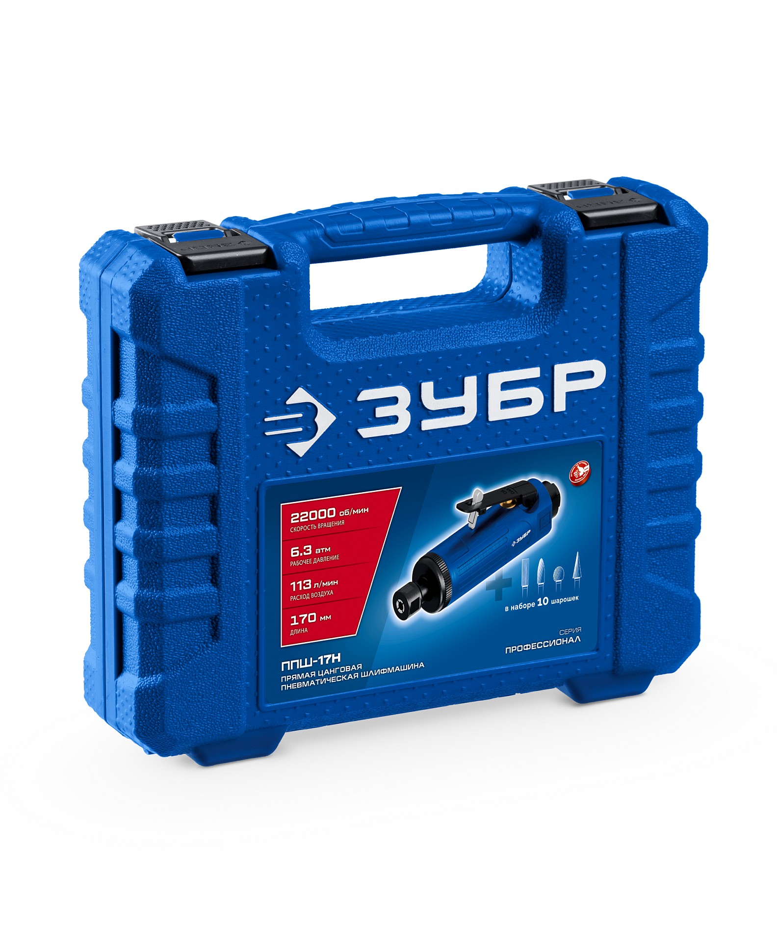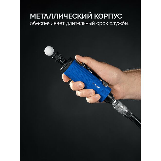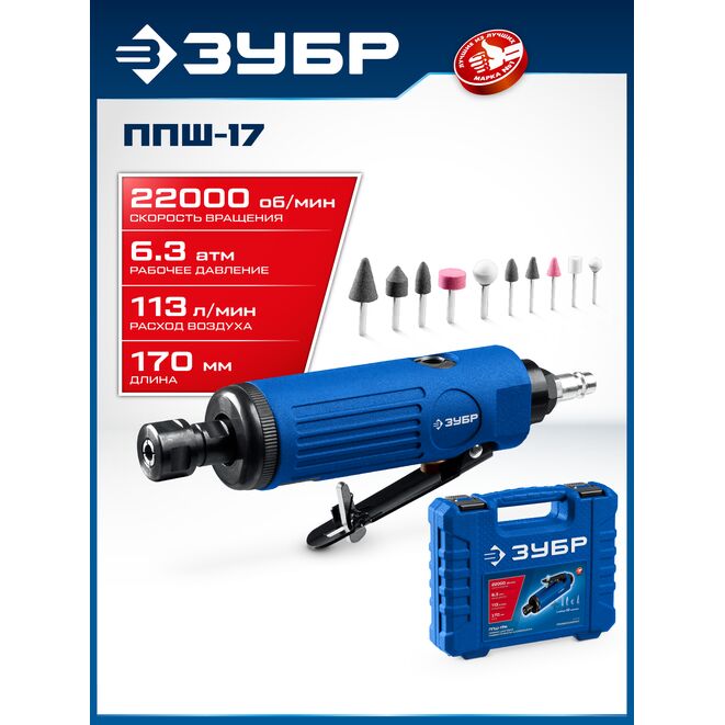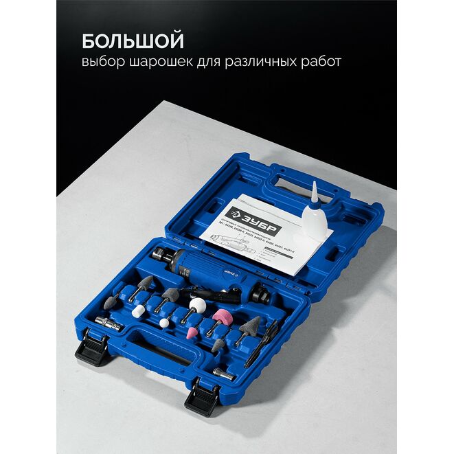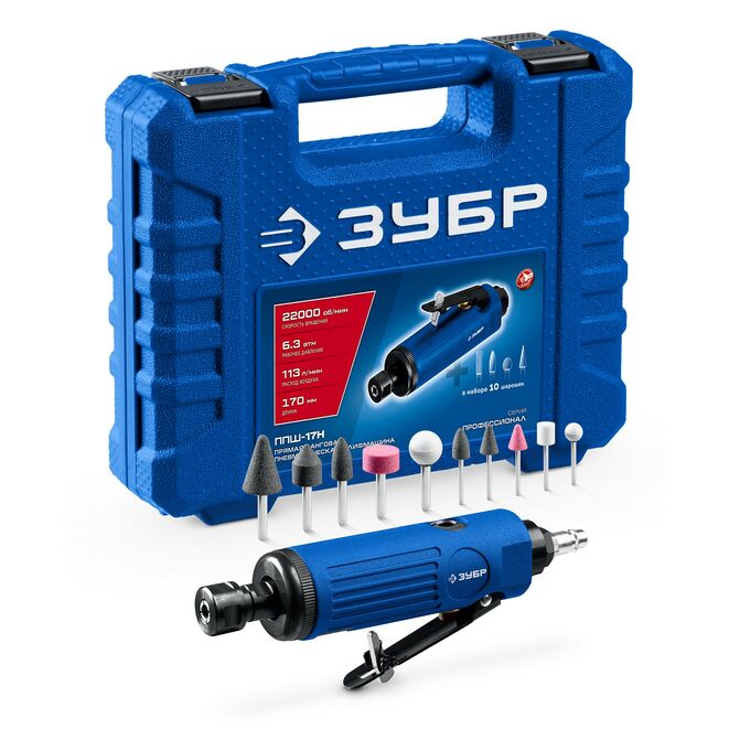 ЗУБР набор в кейсе: прямая цанговая пневмошлифмашина, 10 шарошек и оснастка, ПРОФЕССИОНАЛ (64333-H)