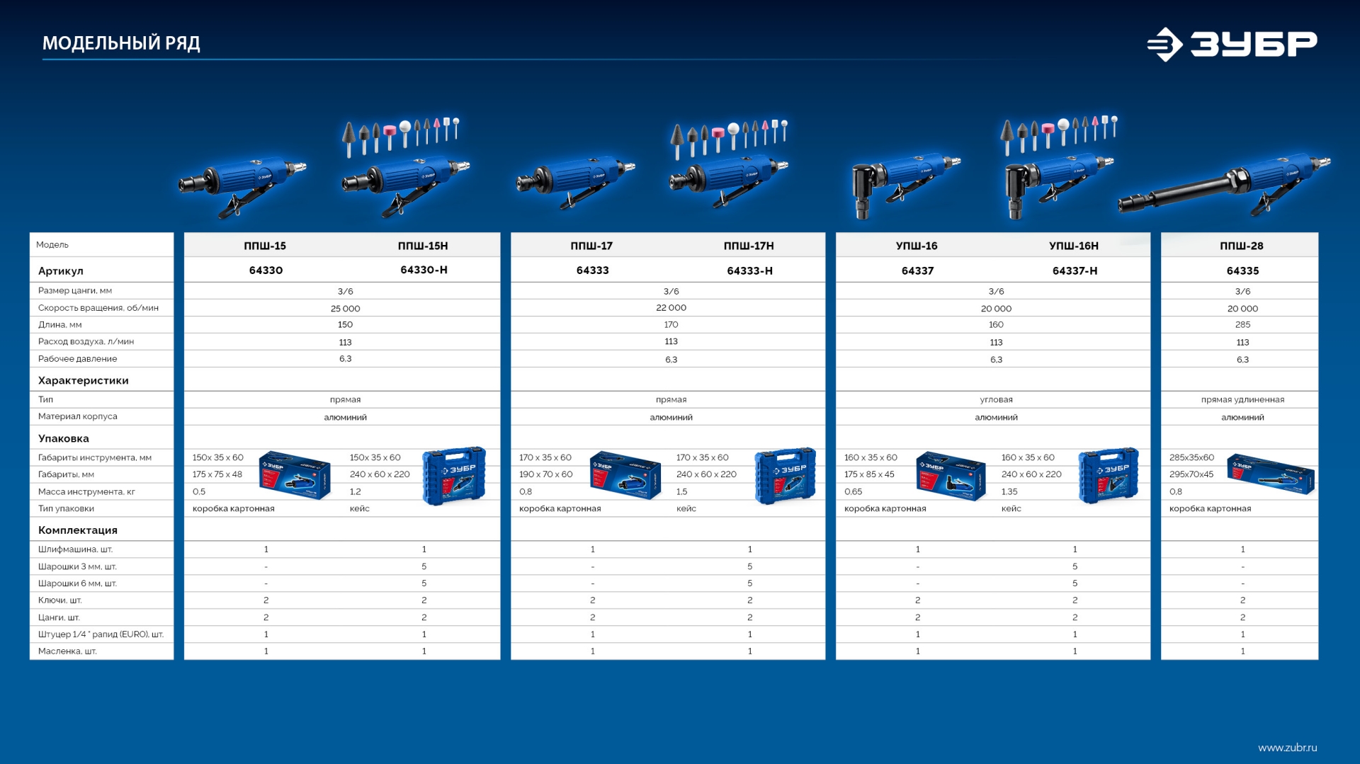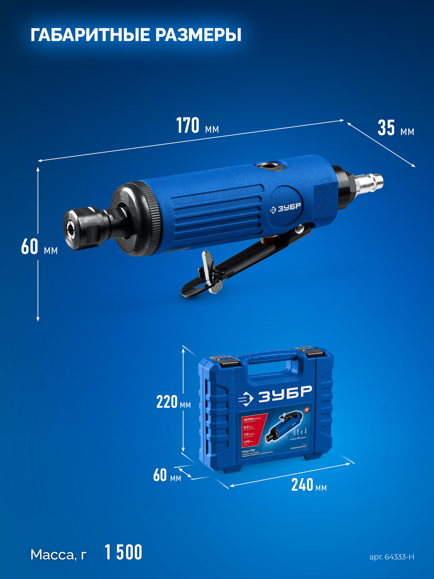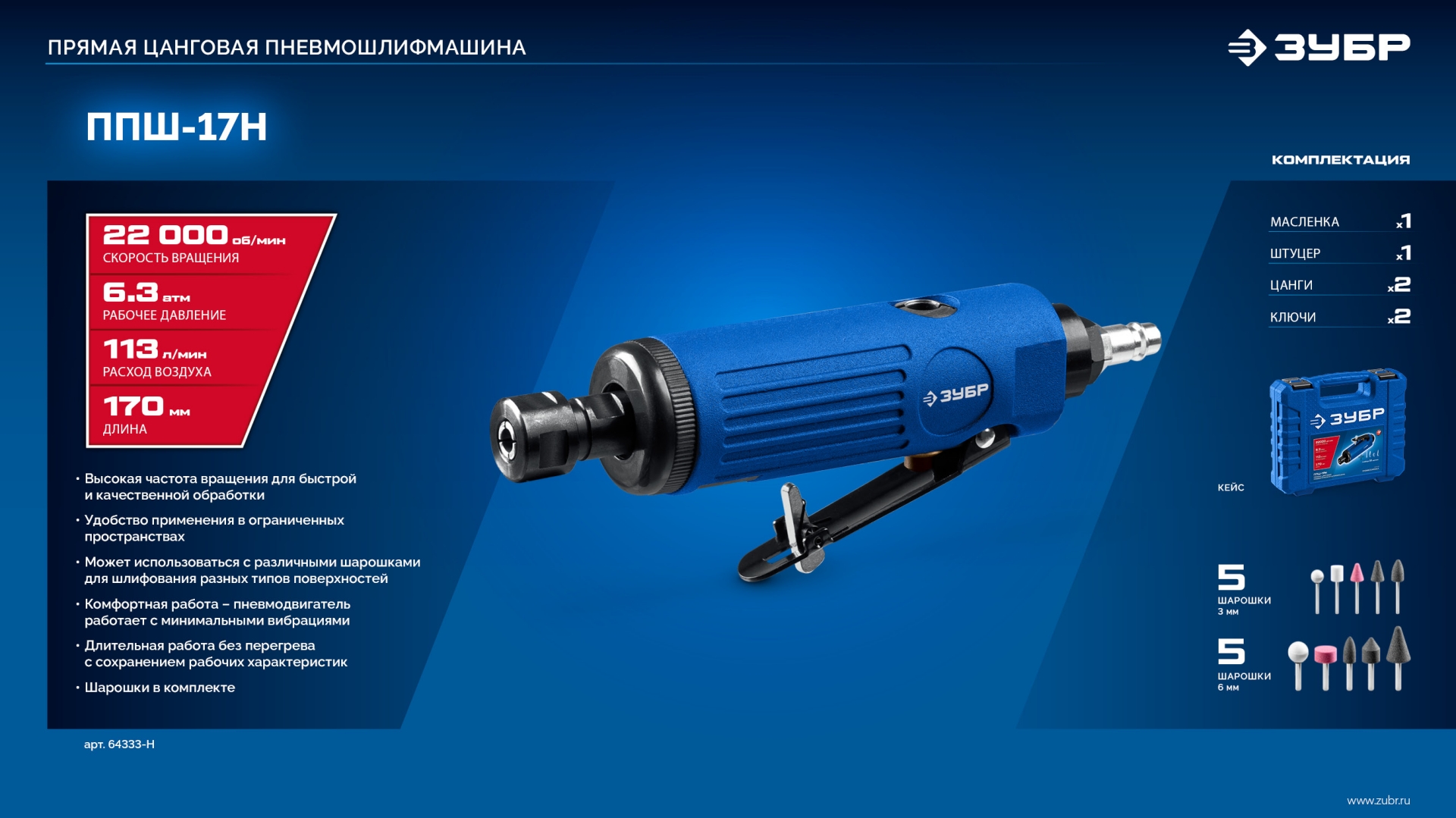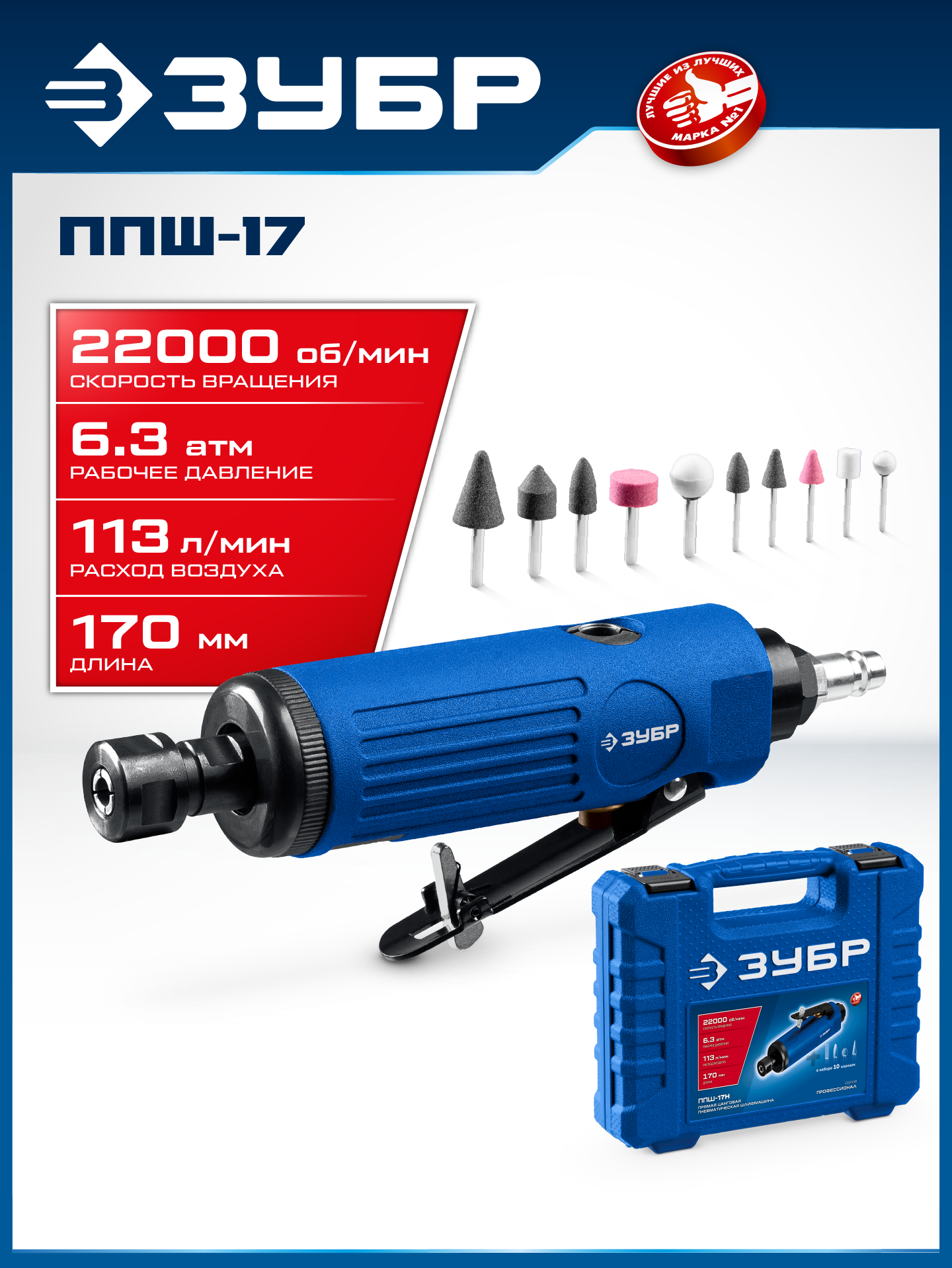 ЗУБР набор в кейсе: прямая цанговая пневмошлифмашина, 10 шарошек и оснастка, ПРОФЕССИОНАЛ (64333-H)