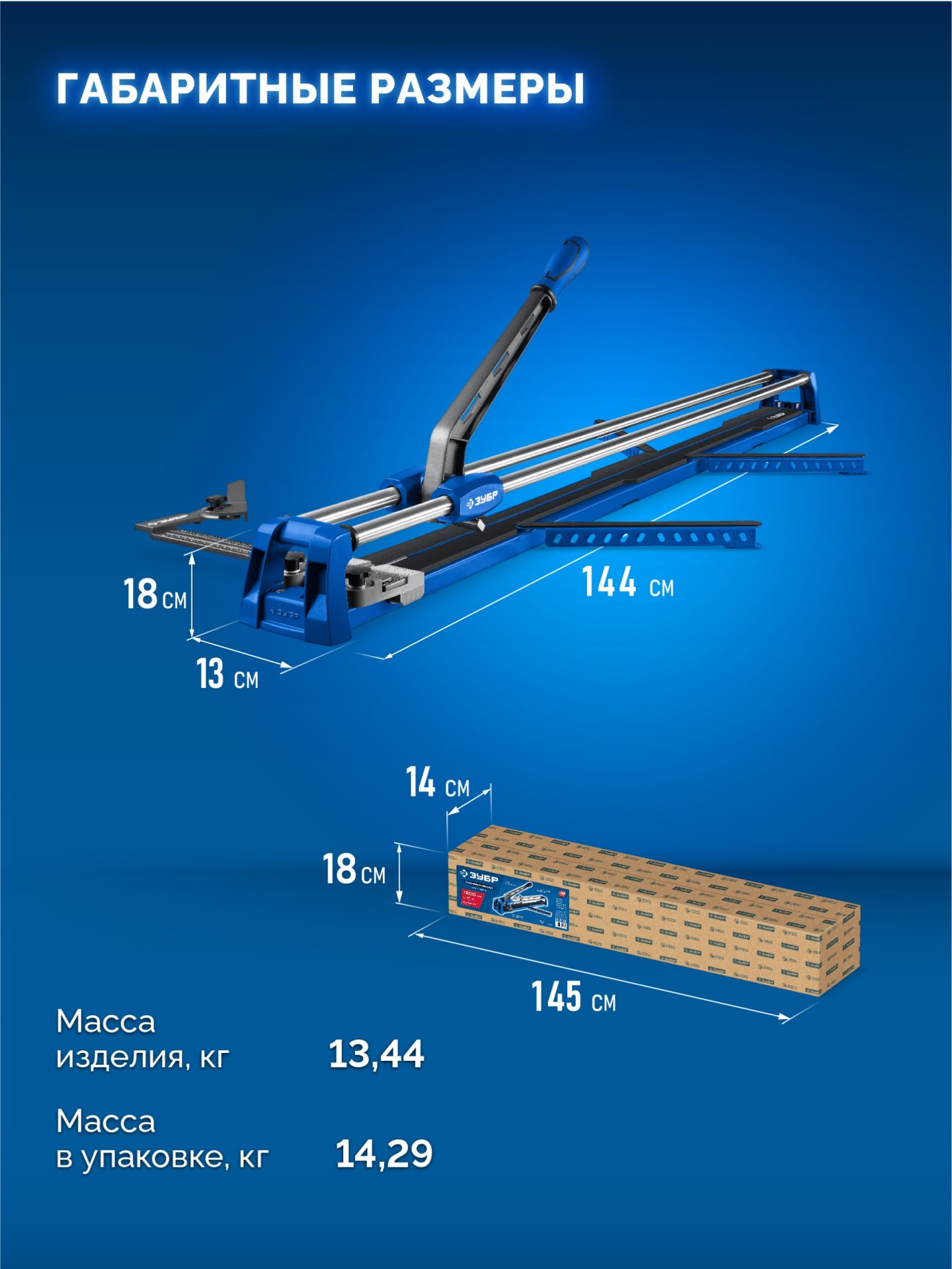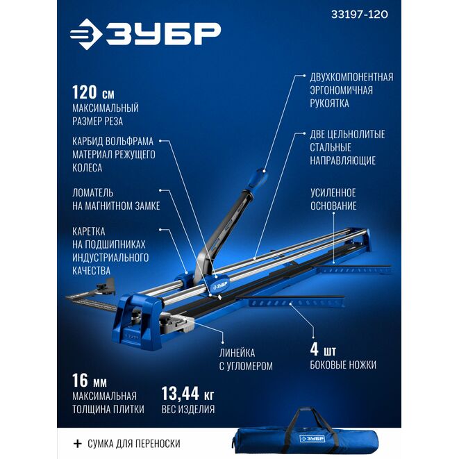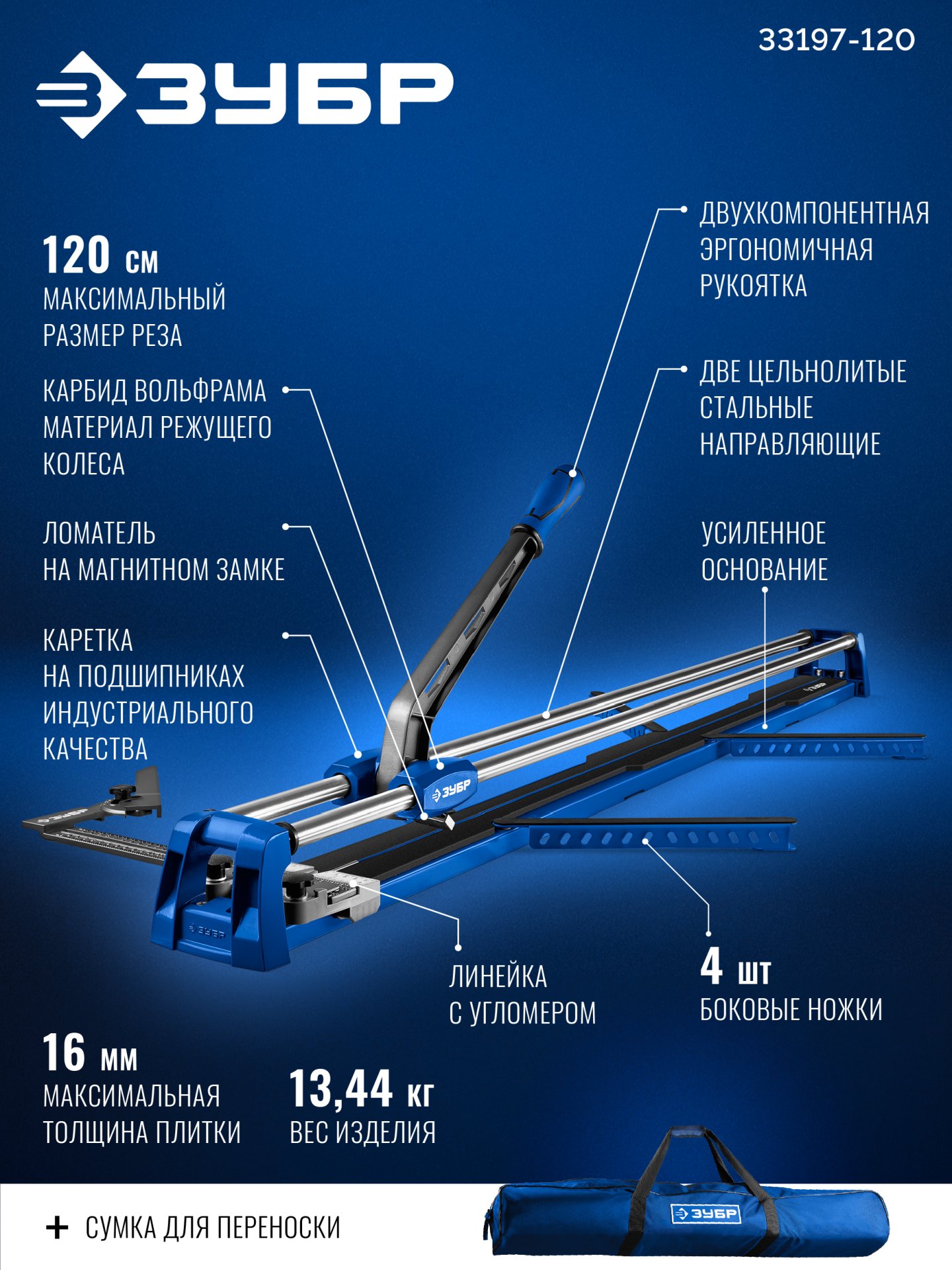 Плиткорез ЗУБР 33197-120 предназначен для разрезания крупноформатной плитки из керамики, клинкера, керамогранита и бетона толщиной до 16 мм. Имеет боковые упоры для облегчения работы с плиткой крупного формата и линейку с угломером для реза плитки в диапазоне углов от 0 до 60°.