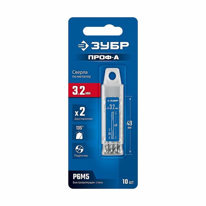 ЗУБР Профессионал 3.2х49мм, Сверло двухстороннее по металлу Проф-А, сталь Р6М5, класс А, 10 шт (29627-3.2-10)