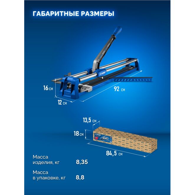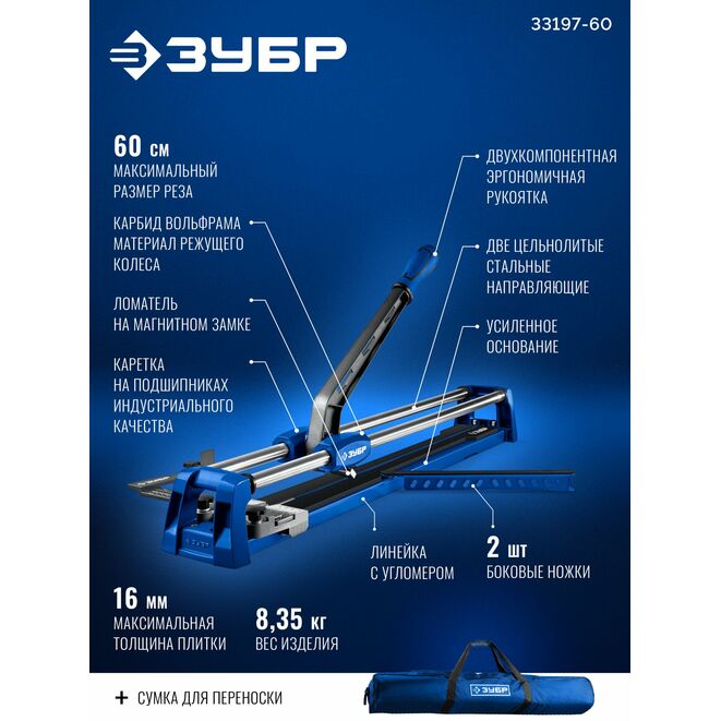 Плиткорез ЗУБР 33197-60 предназначен для разрезания крупноформатной плитки из керамики, клинкера, керамогранита и бетона толщиной до 16 мм. Имеет боковые упоры для облегчения работы с плиткой крупного формата и линейку с угломером для реза плитки в диапазоне углов от 0 до 60°.