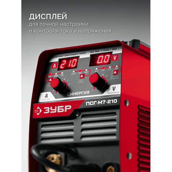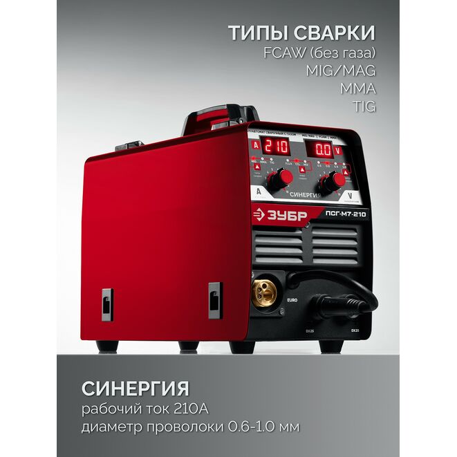 Инверторный полуавтоматический сварочный аппарат ЗУБР ПСГ-М7-210, предназначен для сваривания металлов методами FCAW, MIG/MAG, MMA, TIG. Изделие может применяться для сварки различных видов металлов.Характеристики ЗУБР ПСГ-М7-210: