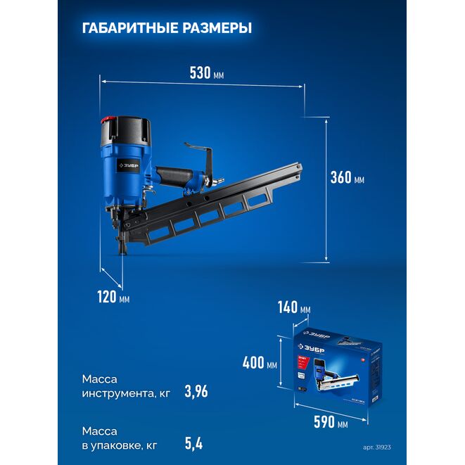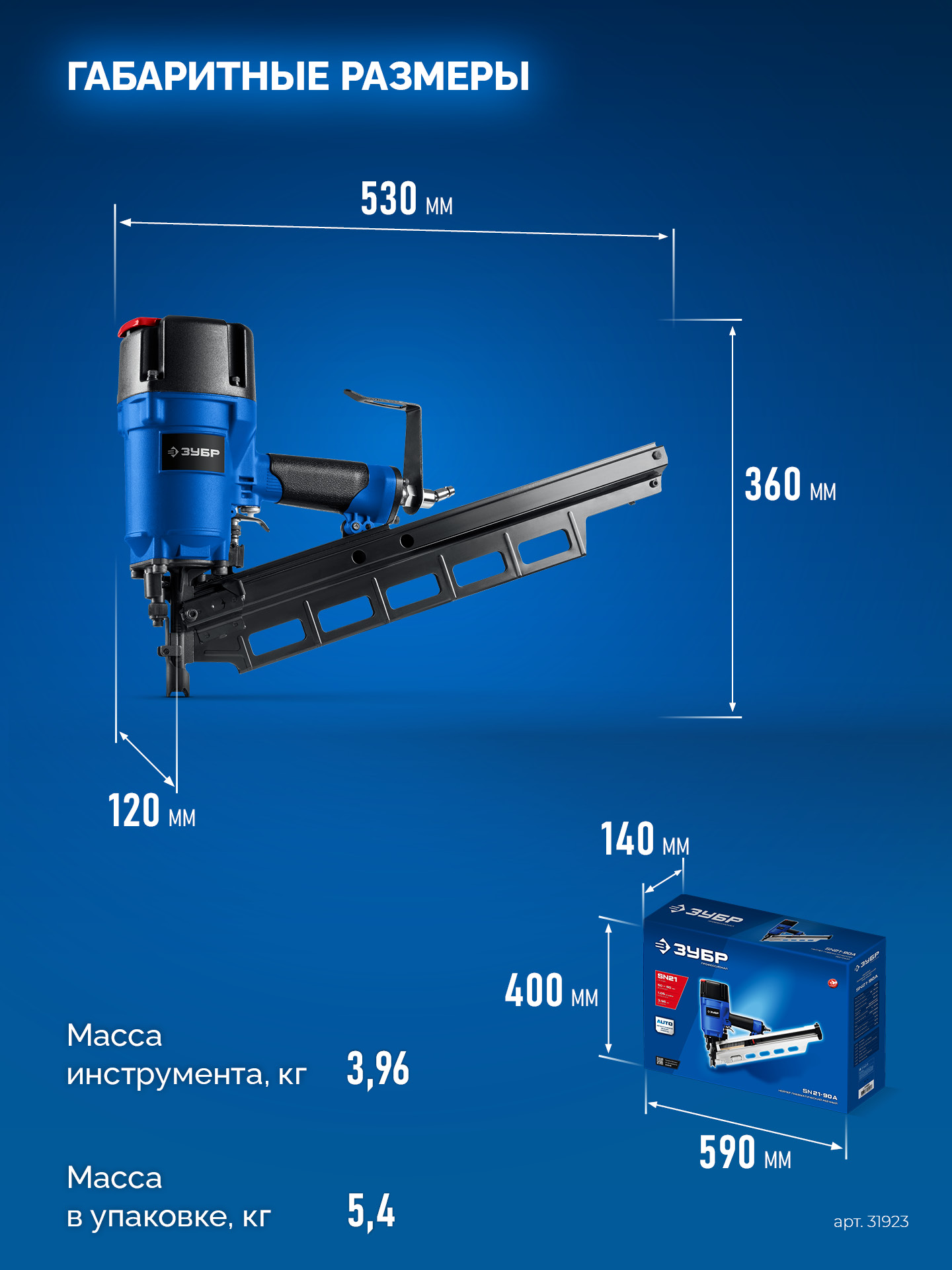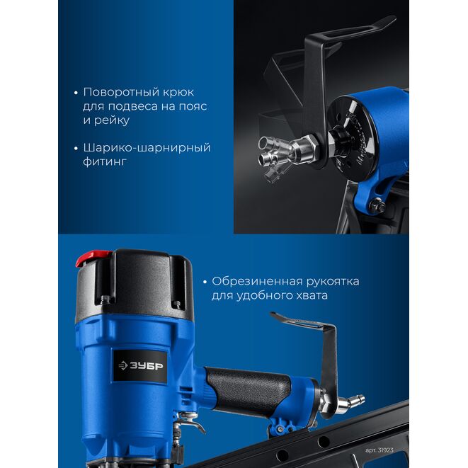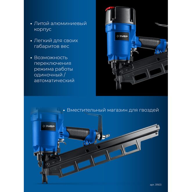 Нейлер (гвоздезабиватель) пневматический для реечных гвоздей ЗУБР SN21-90A, предназначен для cборки деревянных каркасов, монтажа обрешетки, установки черновых полов, внутренней и внешней отделки деревянных конструкций.Характеристики ЗУБР 31923: