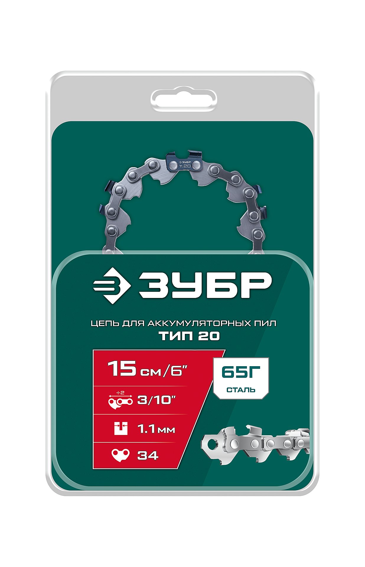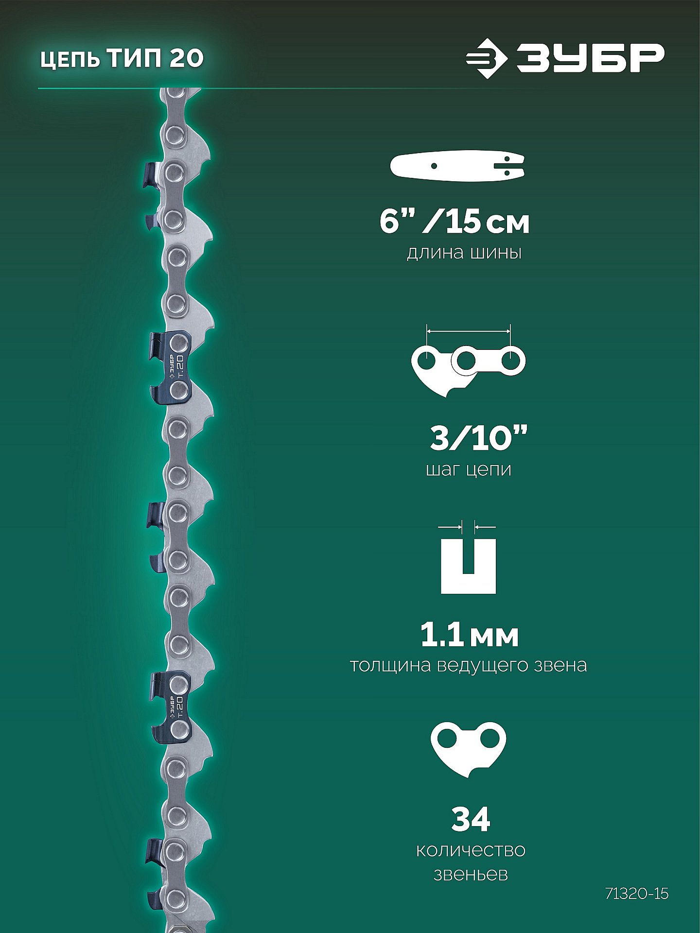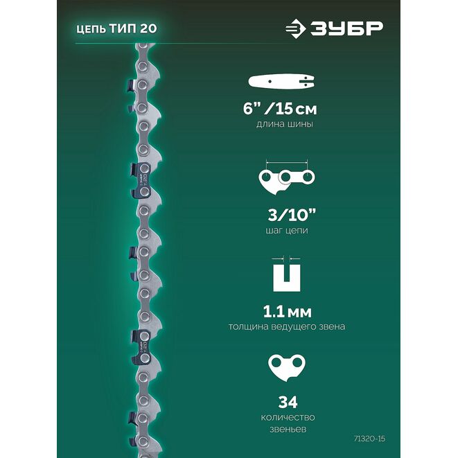 ЗУБР тип 20, 15 см, шаг 3/10", паз 1.1 мм, 34 звеньев, цепь (71320-15)