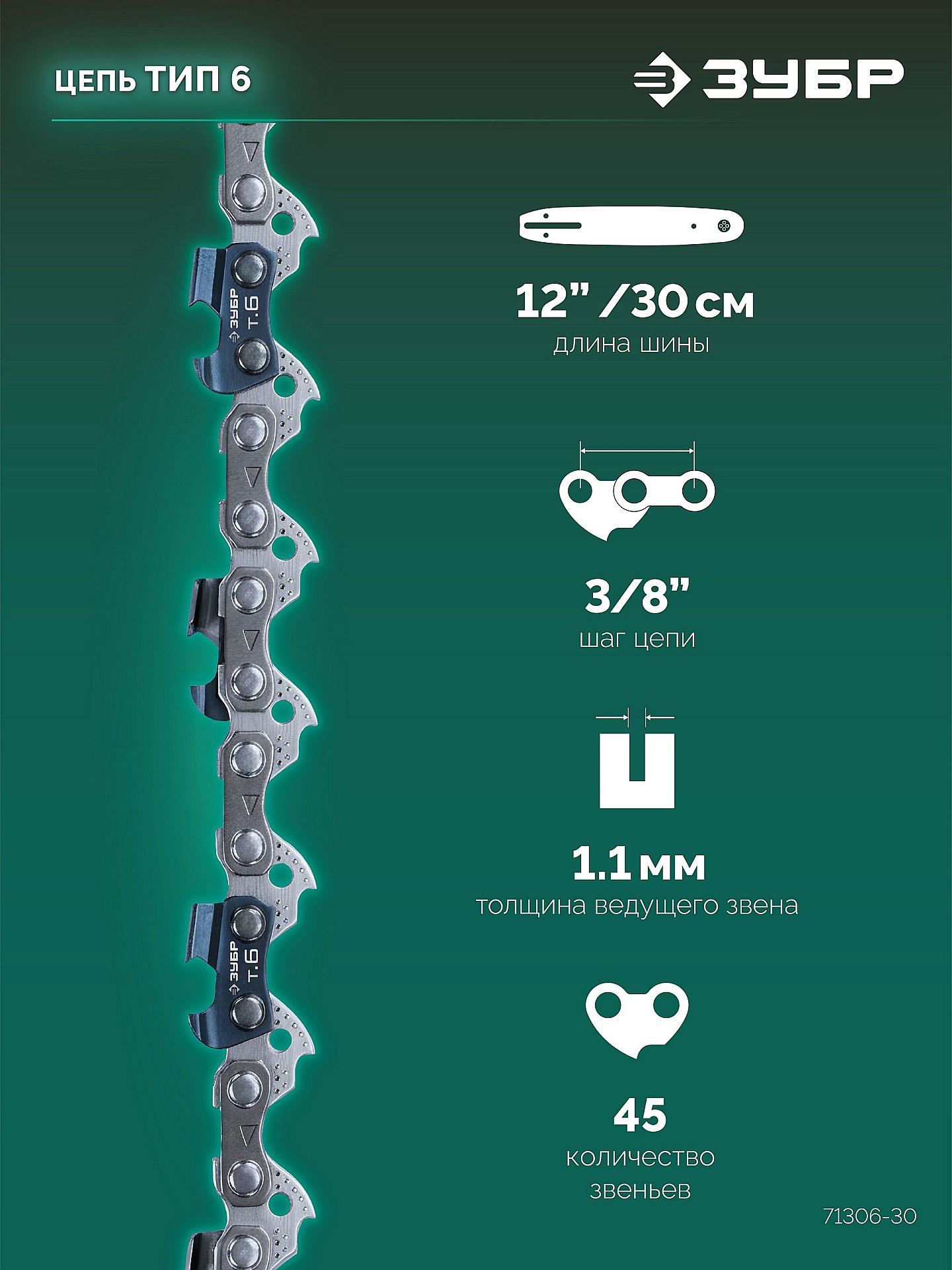 ЗУБР тип 6, 30 см, шаг 3/8", паз 1.1 мм, 45 звеньев, цепь (71306-30)