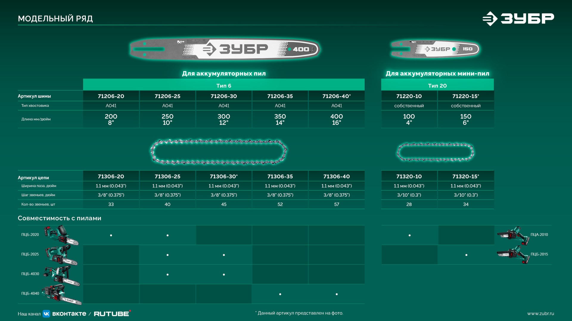 Принадлежности для ЗУБР тип 6, 40 см, шаг 3/8″, паз 1.1 мм, 57 звеньев, шина (71206-40):