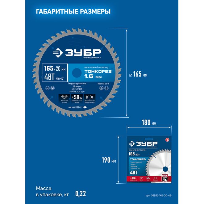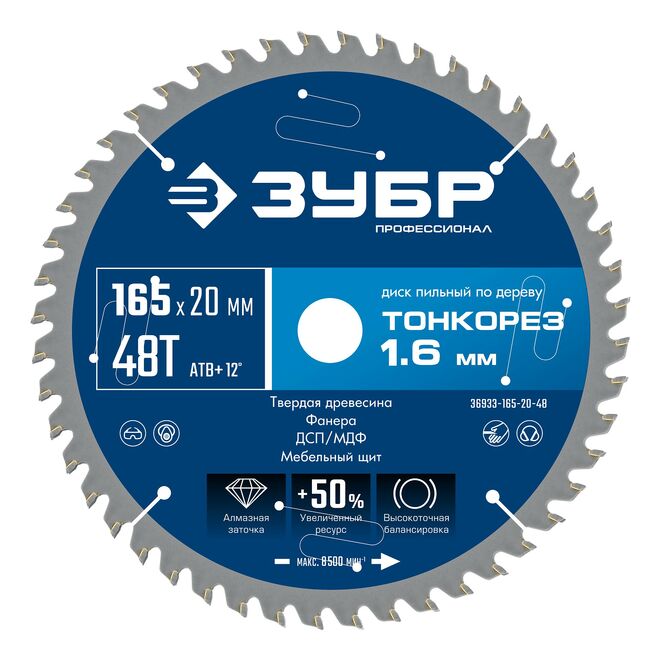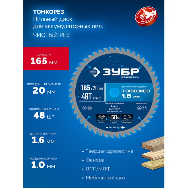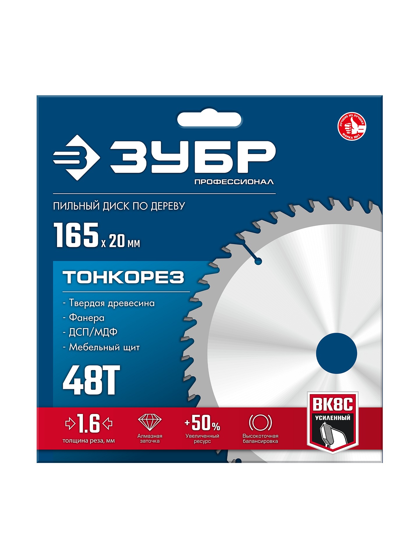 ЗУБР Тонкорез 165х20 x 1.6 мм, 48Т, диск пильный по дереву, тонкий рез, Профессионал (36933-165-20-48)