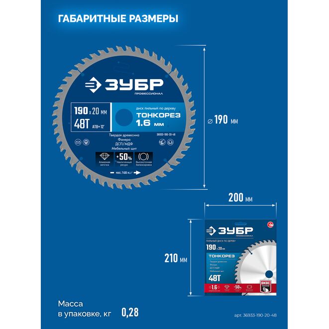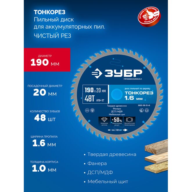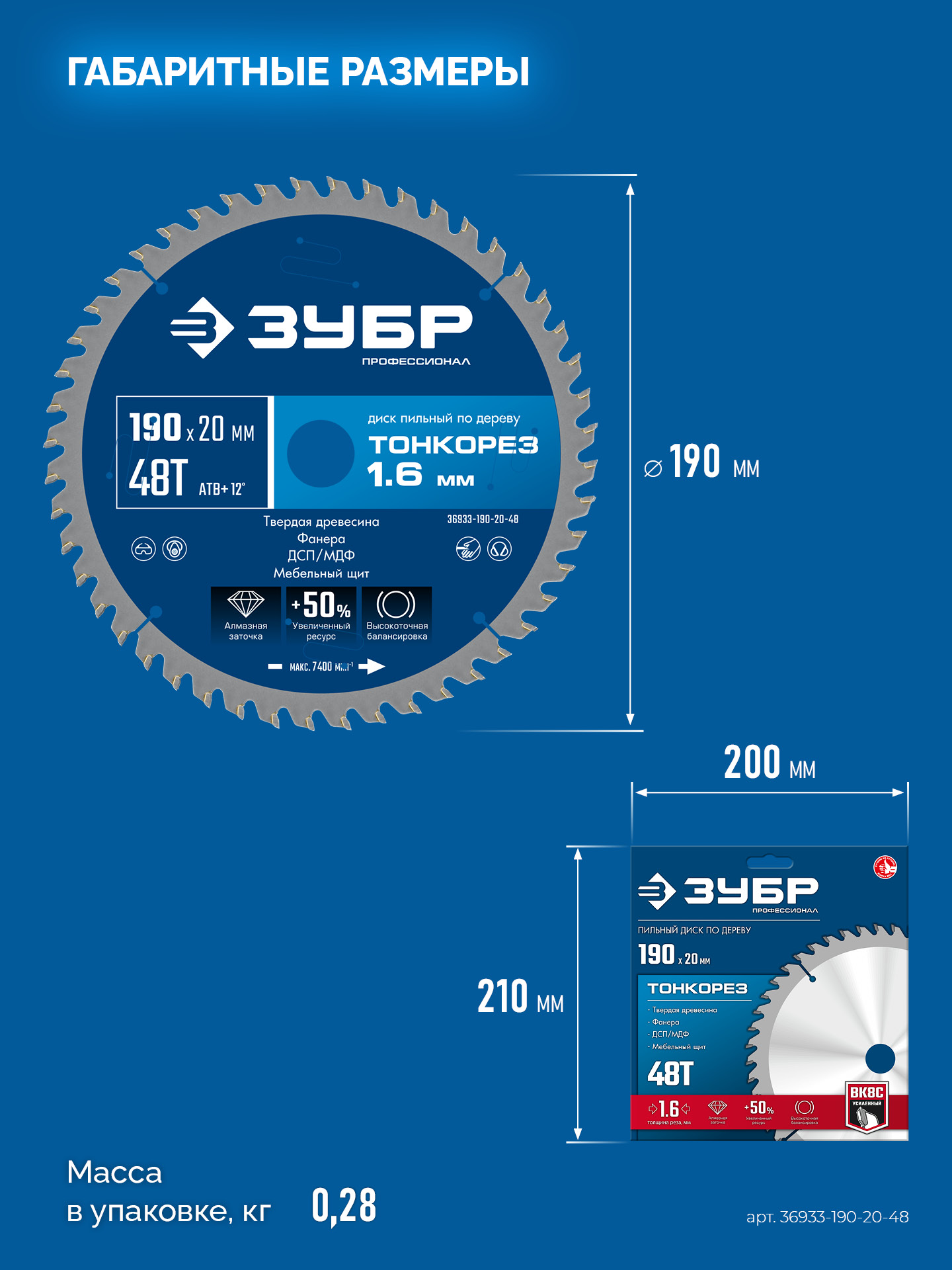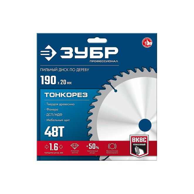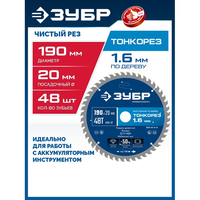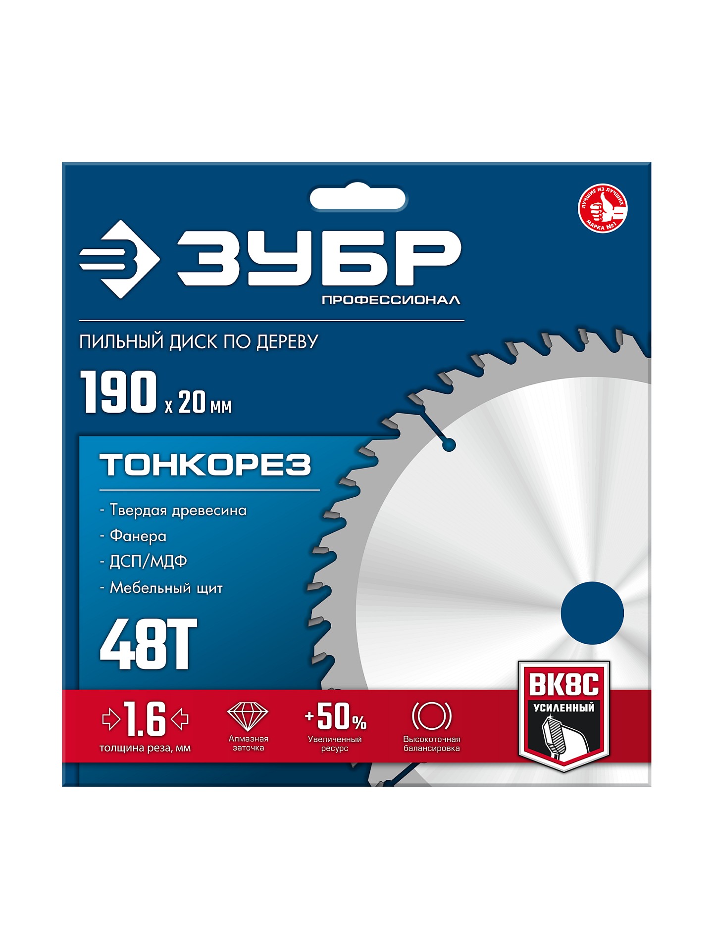 ЗУБР Тонкорез 190х20 x 1.6 мм, 48Т, диск пильный по дереву, тонкий рез, Профессионал (36933-190-20-48)
