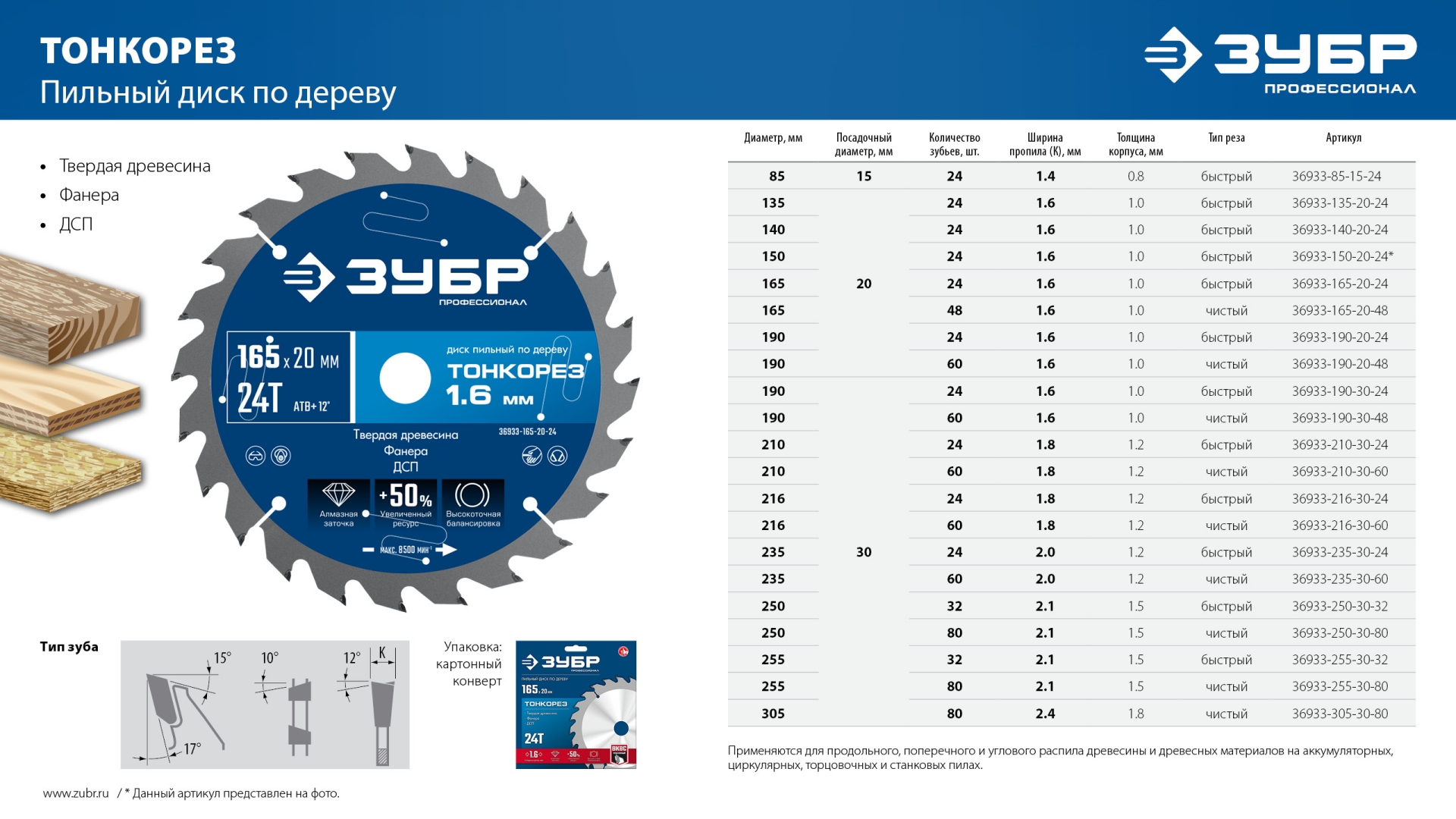 ЗУБР Тонкорез 216х30 x 1.8 мм, 24Т, диск пильный по дереву, тонкий рез, Профессионал (36933-216-30-24)