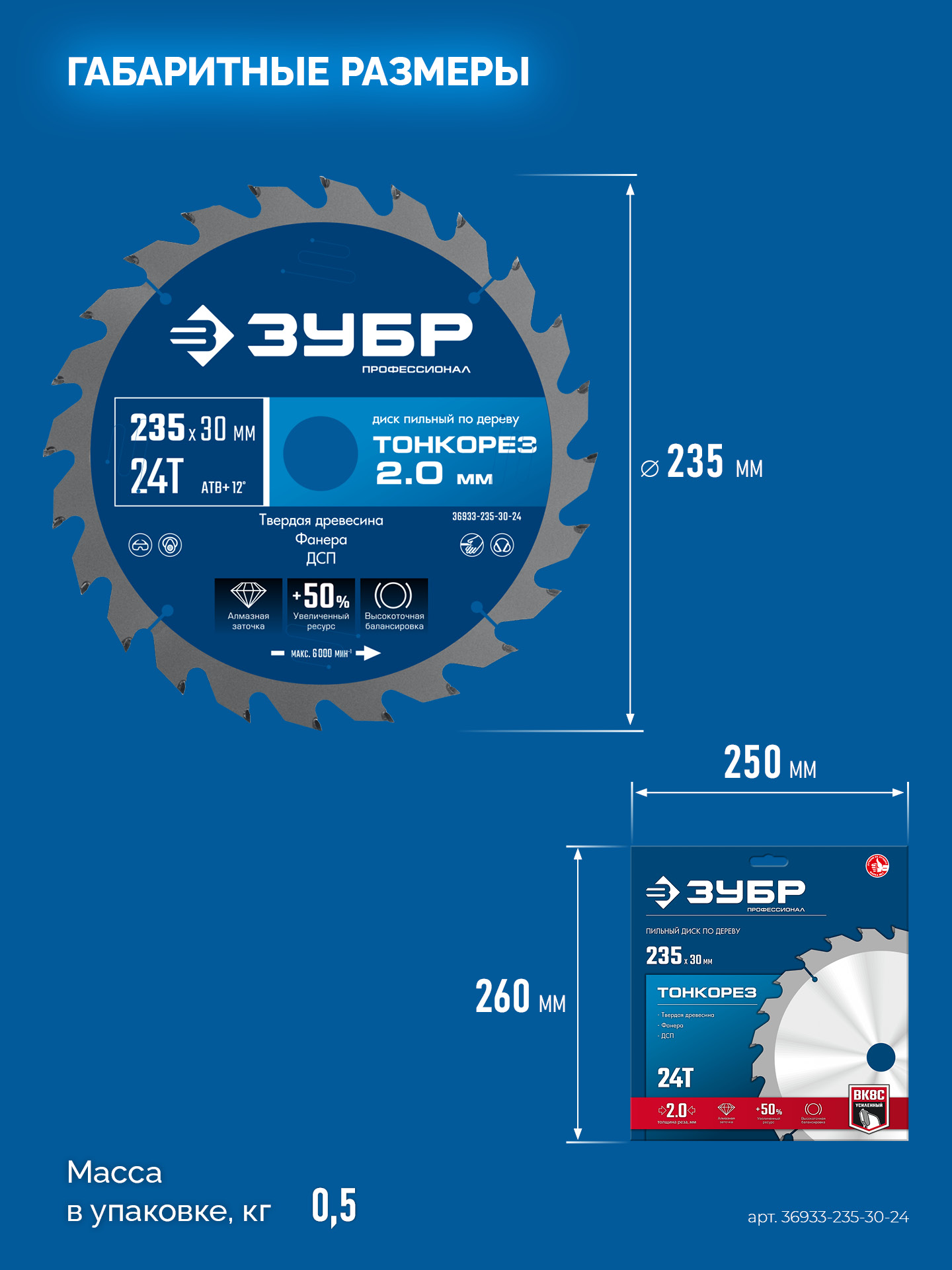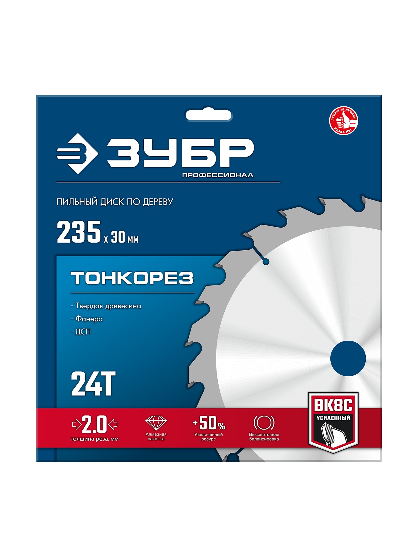 ЗУБР Тонкорез 235х30 x 2.0 мм, 24Т, диск пильный по дереву тонкий рез, Профессионал (36933-235-30-24)