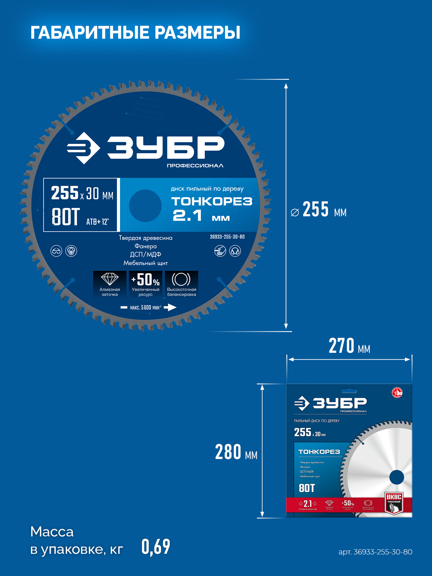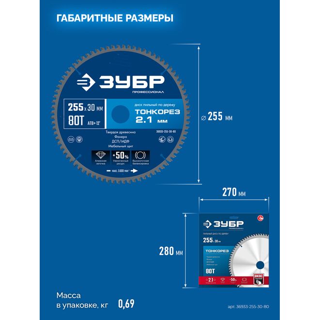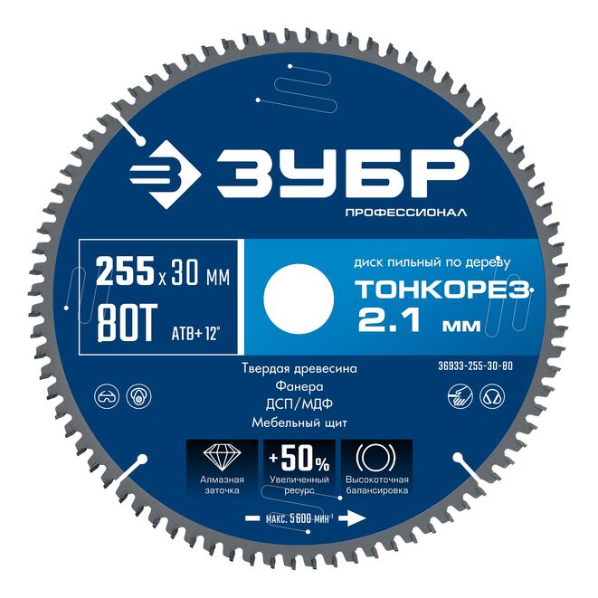 ЗУБР Тонкорез 255х30 x 2.1 мм, 80Т, диск пильный по дереву тонкий рез, Профессионал (36933-255-30-80)